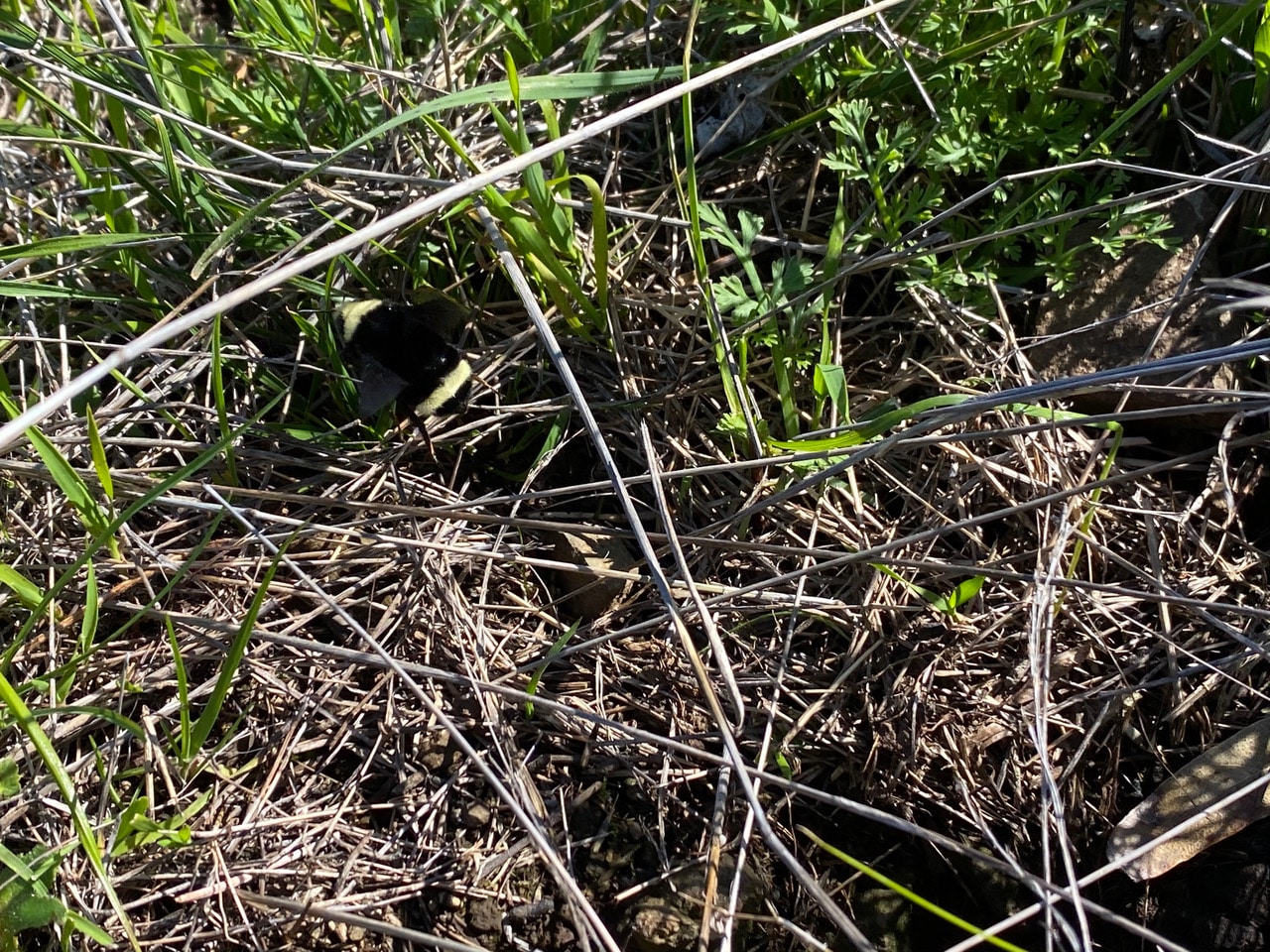 With a loud buzz, the Yellow-faced Bumble Bee (see her yellow head and yellow-banded abdomen?) emerges from another hole a couple of feet away. These holes are all interconnected! I wonder if the bee found the space agreeable.