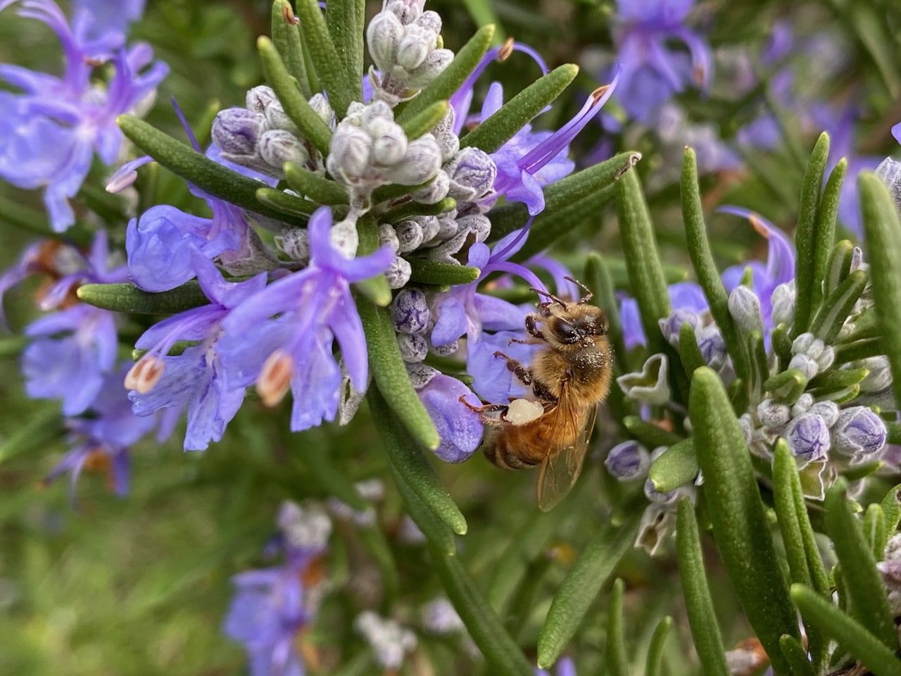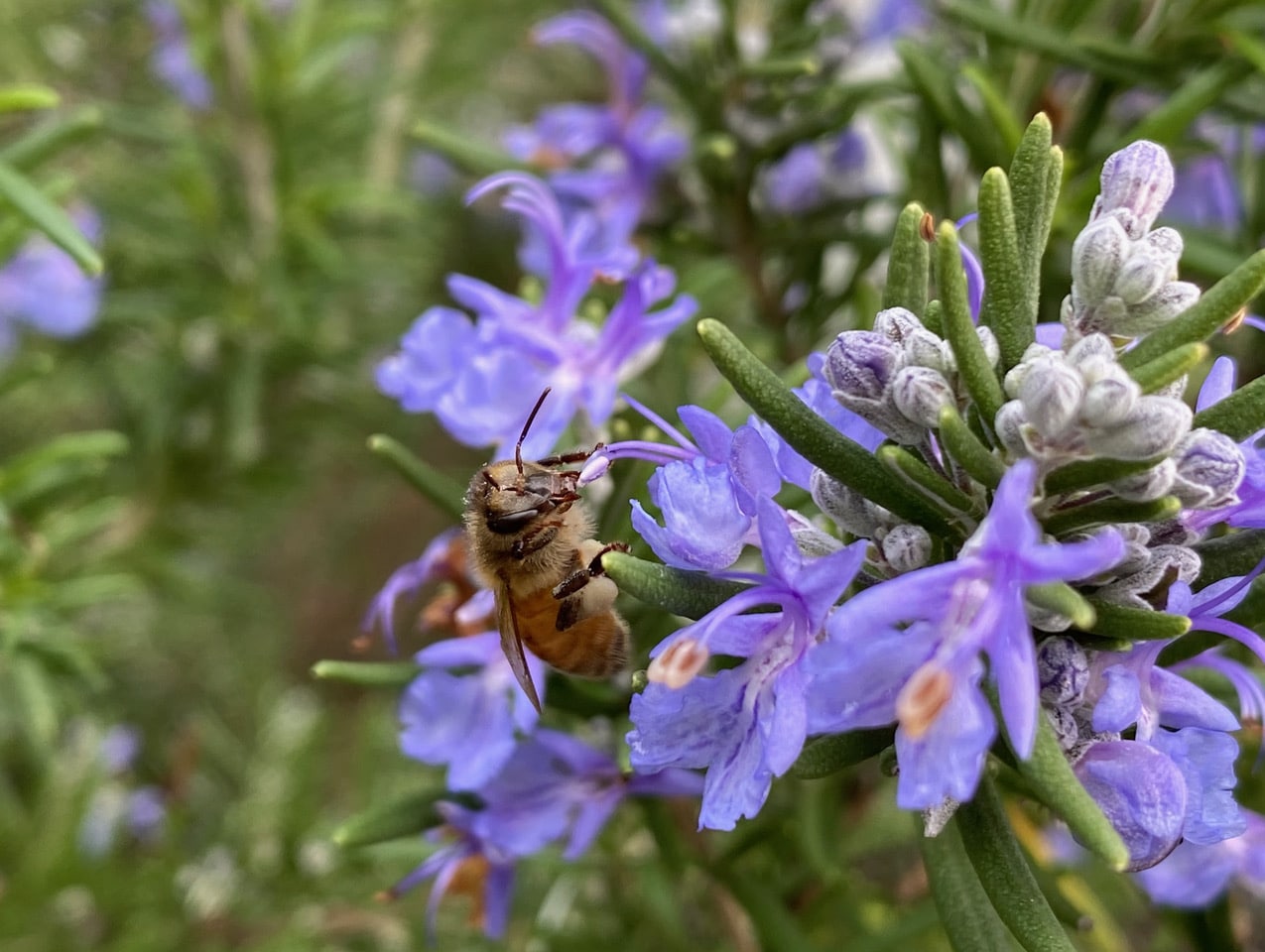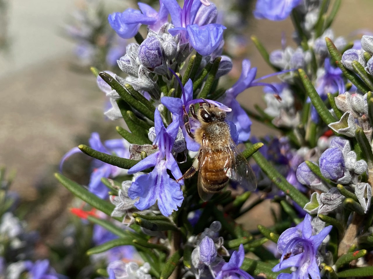 This other Honey Bee is sitting squarely on the lower lip of a Rosemary flower and reaching up to collect pollen from the anthers.