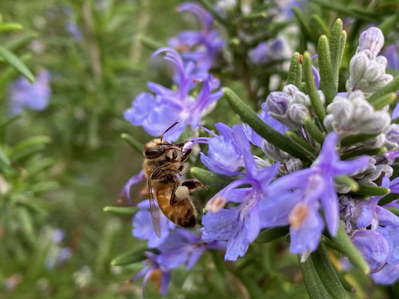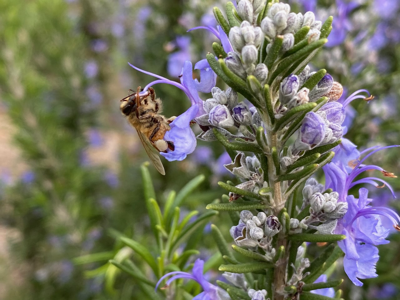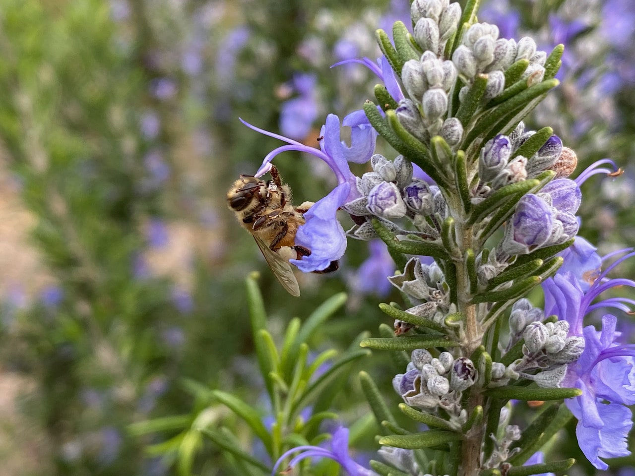 This other Honey Bee is sitting squarely on the lower lip of a Rosemary flower and reaching up to collect pollen from the anthers.
