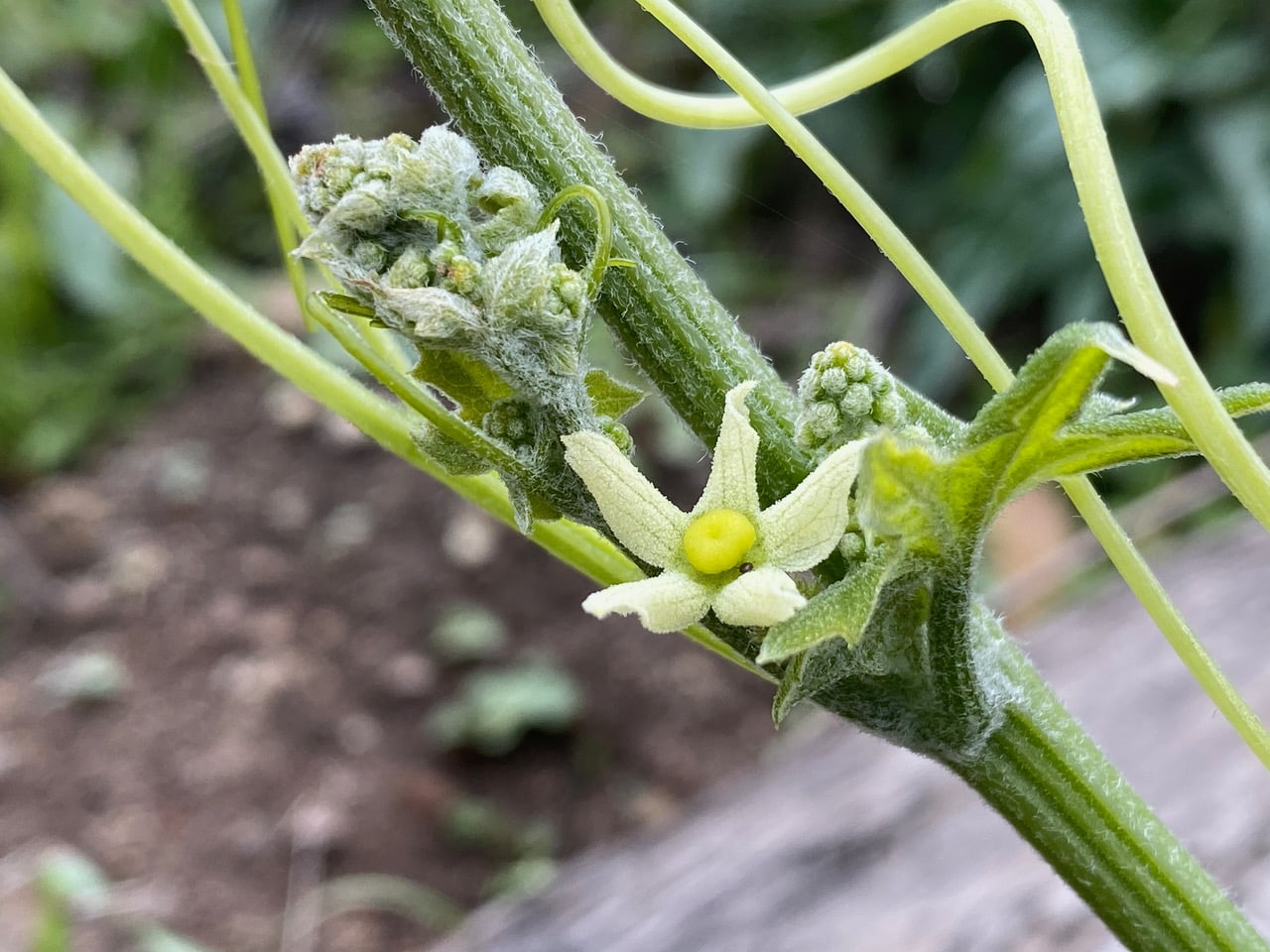 On a California Manroot, Marah fabacea, a female flower has opened up at the leaf axil below the cluster of male flowers still in tight buds. As I look around, this development is the same in all the vines I find today. It’s amazing that I have failed to see this for all these years. I guess you have to catch the first flowers on the vine to appreciate what’s happening. Apparently, the monoecious plant has separated the bloom time of its male and female flowers to avoid self-pollination. How clever! The temporal separation of the sexes is termed dichogamy, but I have thought it only applies to the maturation of the reproductive structures of bisexual flowers! Can the Manroot be considered a plant exhibiting protogynous (female-first ) tendency?