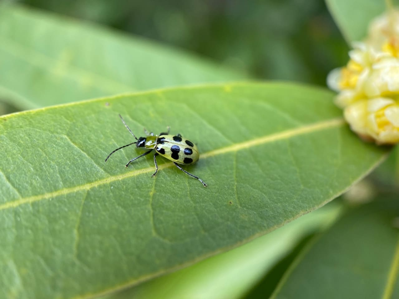 Hey, my first Spotted Cucumber Beetle of the year! These common beetles have the improbable scientific name of Diabrotica undecimpunctata (family Chrysomelidae).