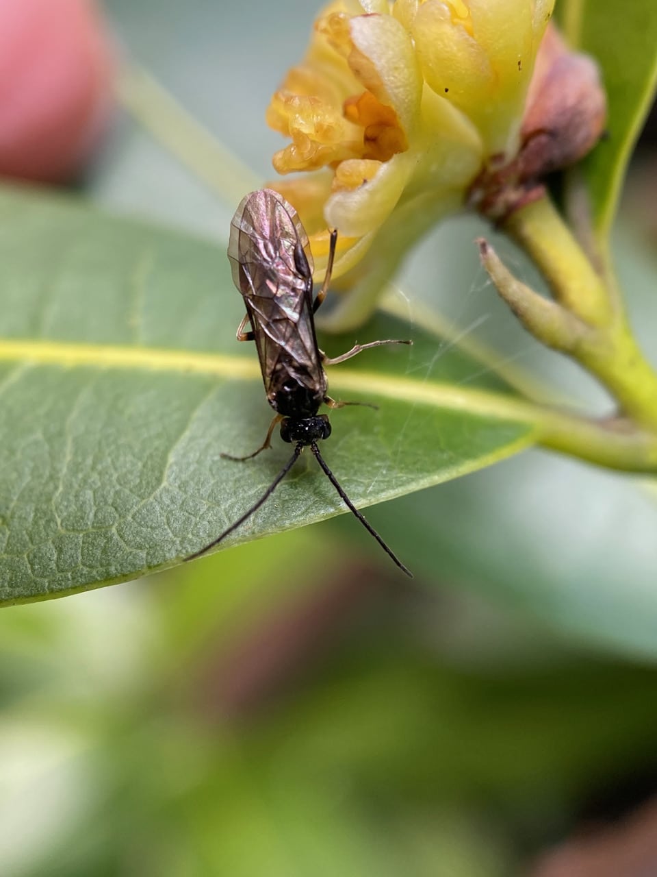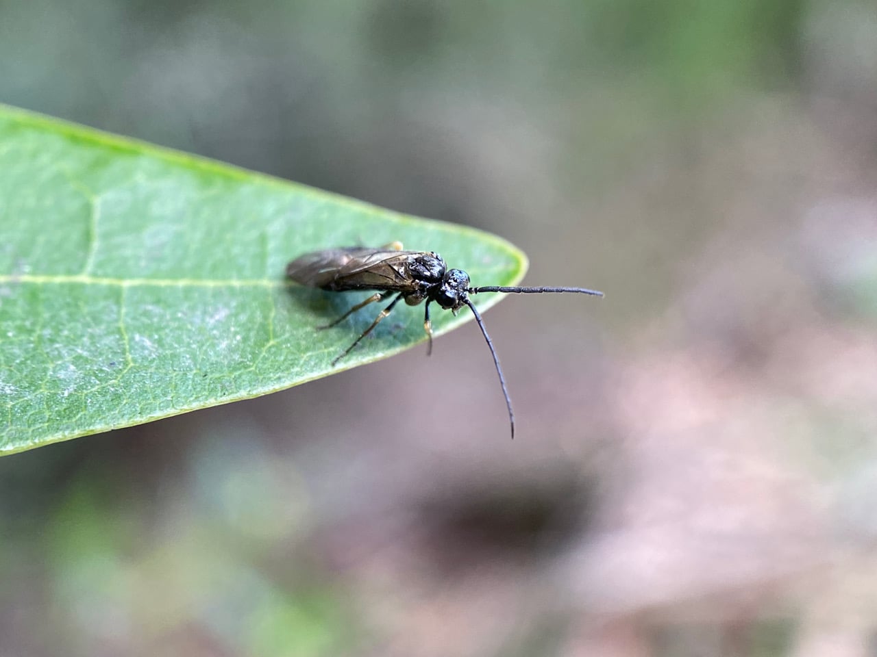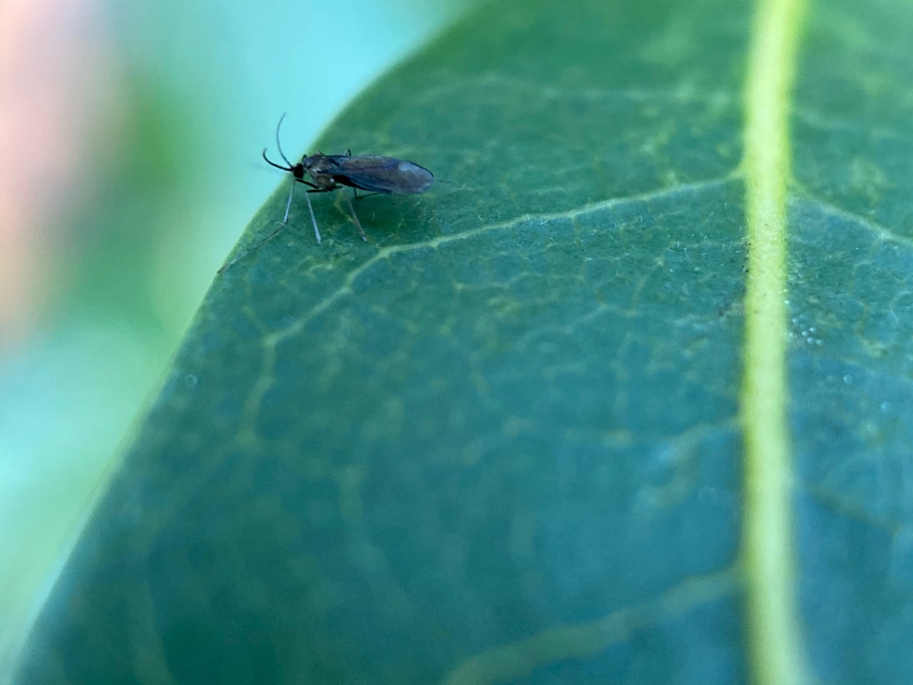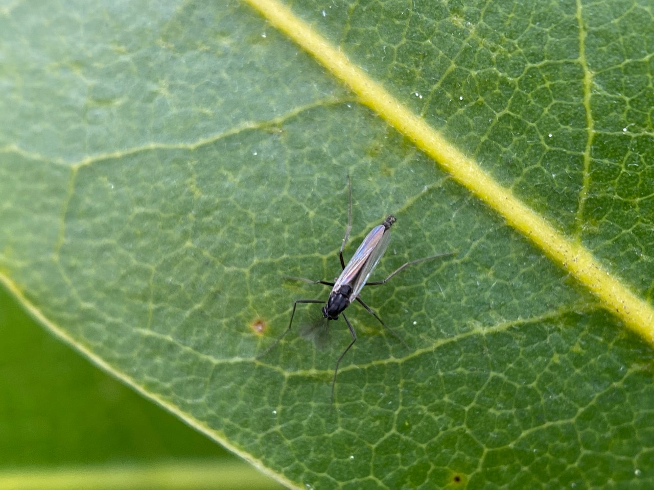 Here’s a similar insect on a Bay leaf, but smaller still. Perhaps a member of the superfamily Sciaroidea?