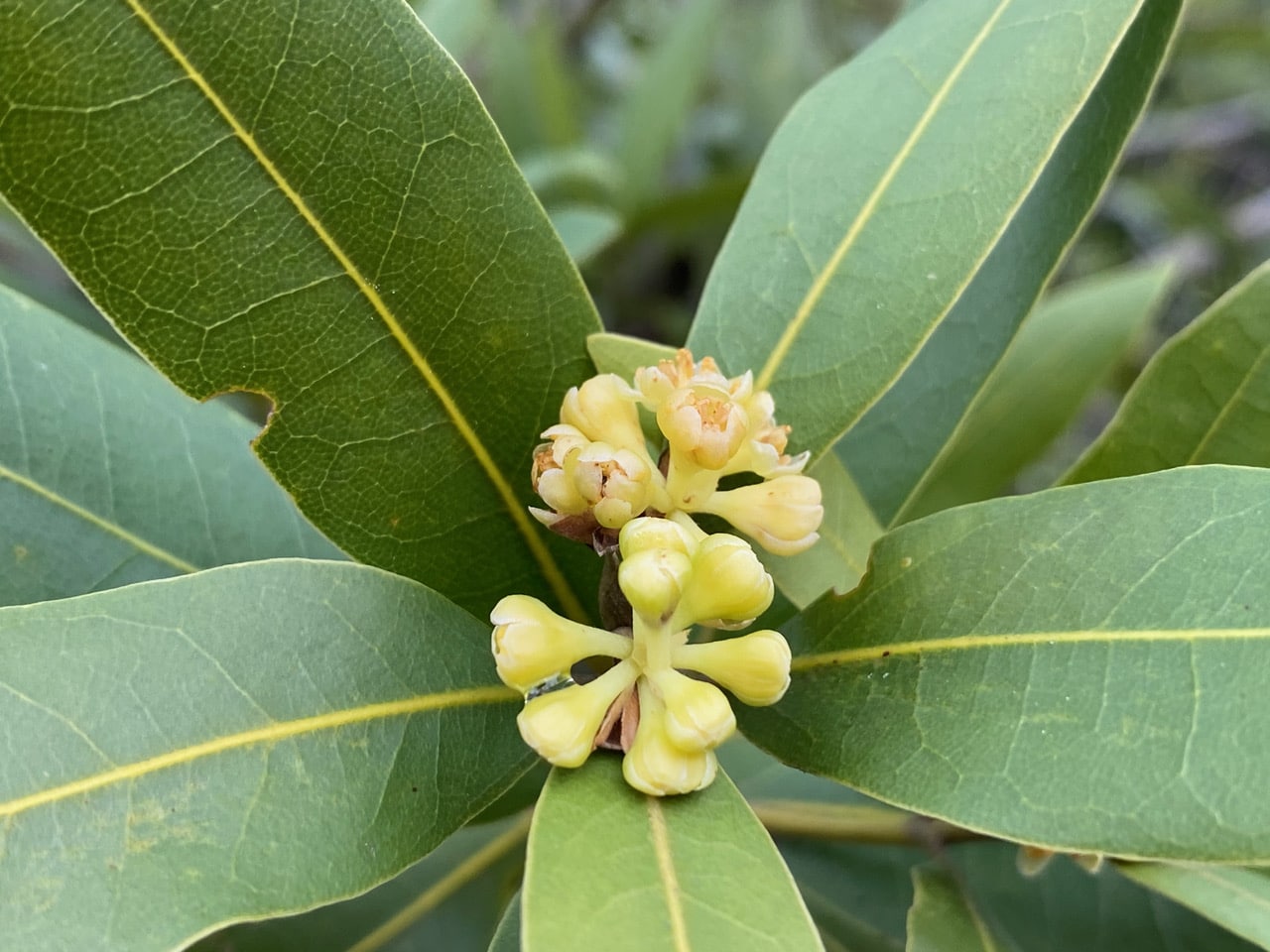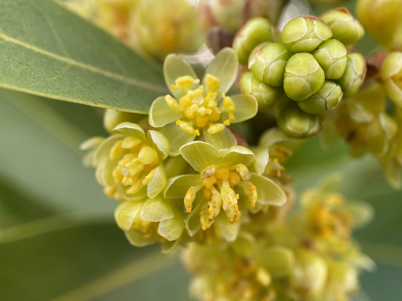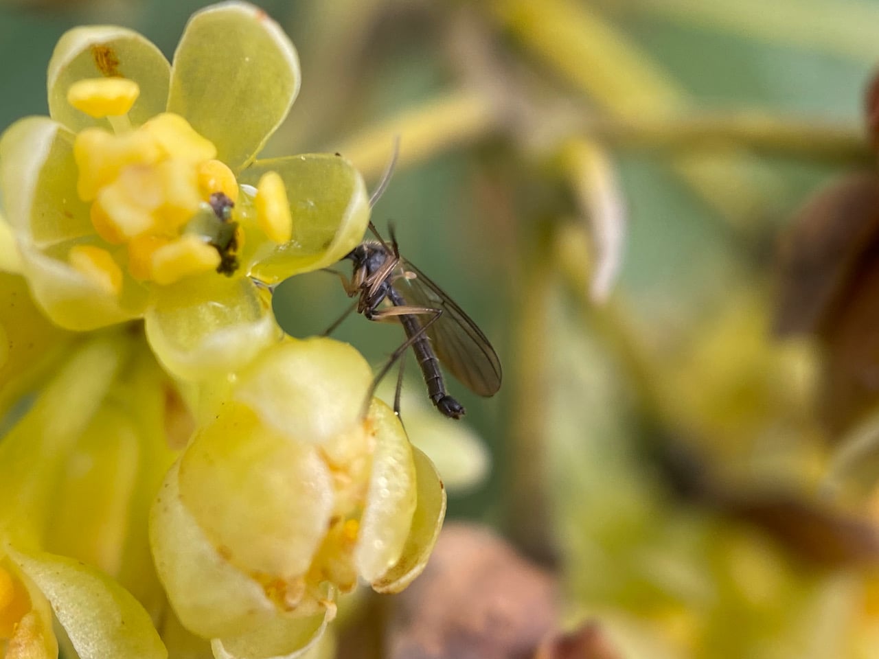 I spot three midges on these young California Bay flowers, but they scatter as I approach with the camera.