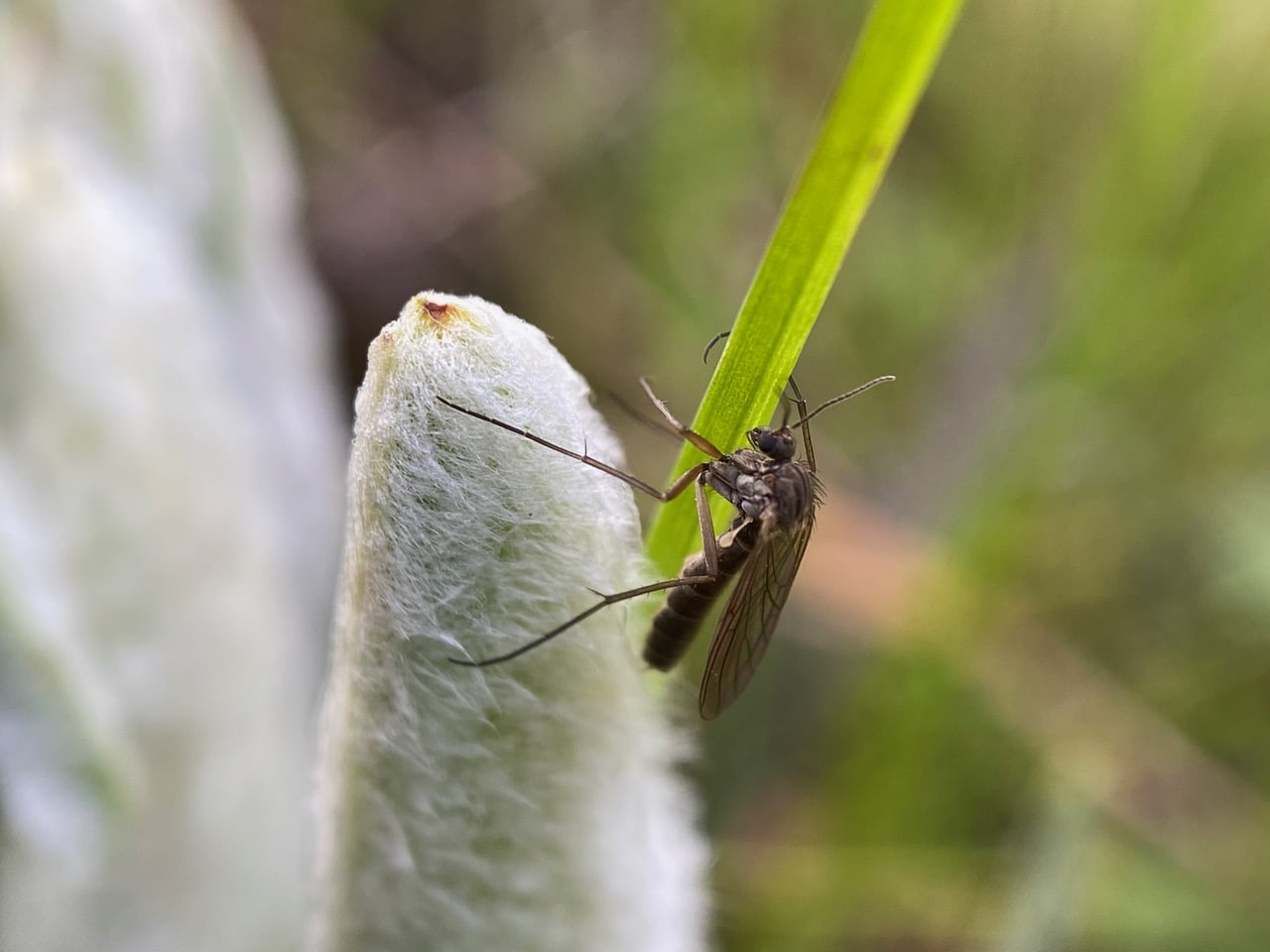 A midge is hanging on the tip of a Wooly Mule’s Ears leaf and a neighboring blade of grass.