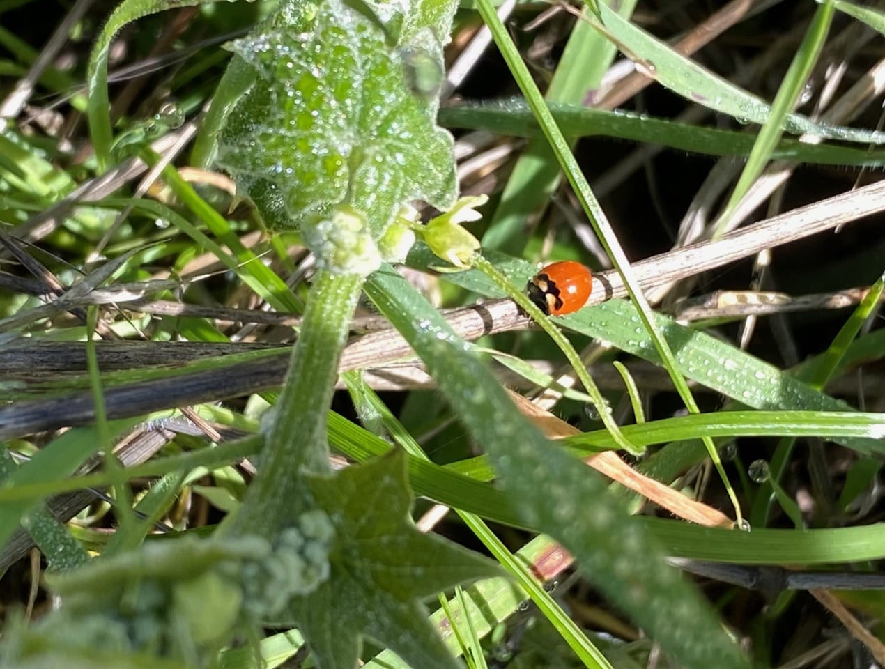Ooh, an unusual Lady Beetle is crawling on the tangle of vegetation under the Marah vine! Instead of spots, this ladybeetle has rather unusual markings on its elytra! It’s the Three-banded Ladybeetle, Coccinella trifasciata (family Coccinellidae), native to North America.