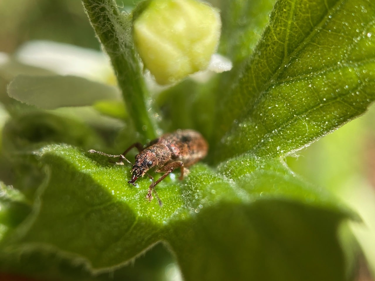 An orange-brown insect is lurking underneath the cucumber flowers. A Weevil (family Curculionidae)?