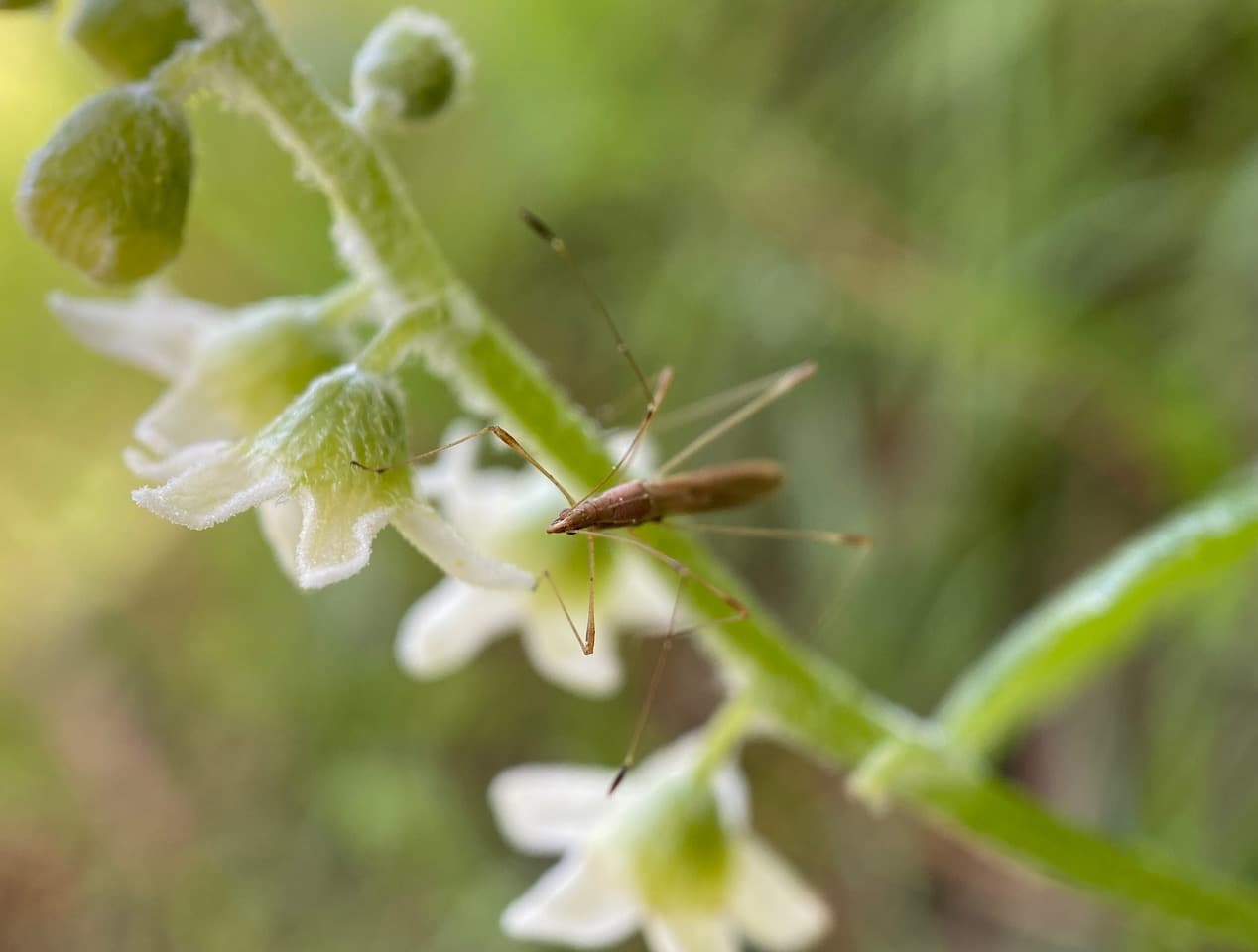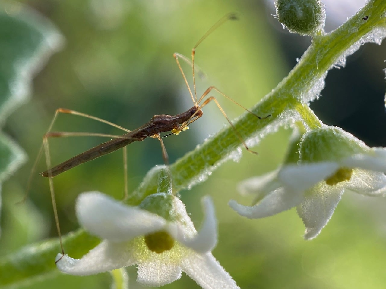 On long, thread-like legs, a Stilt Bug (family Berytidae) is ambling slowly along a flower-covered vine of Coastal Manroot, Marah oregana.