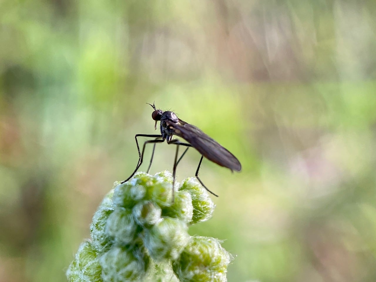 A Dance Fly is perched on a cluster of Marah flower buds. It has a short, stout proboscis. Probably a predatory Dance Fly in the family Empididae.