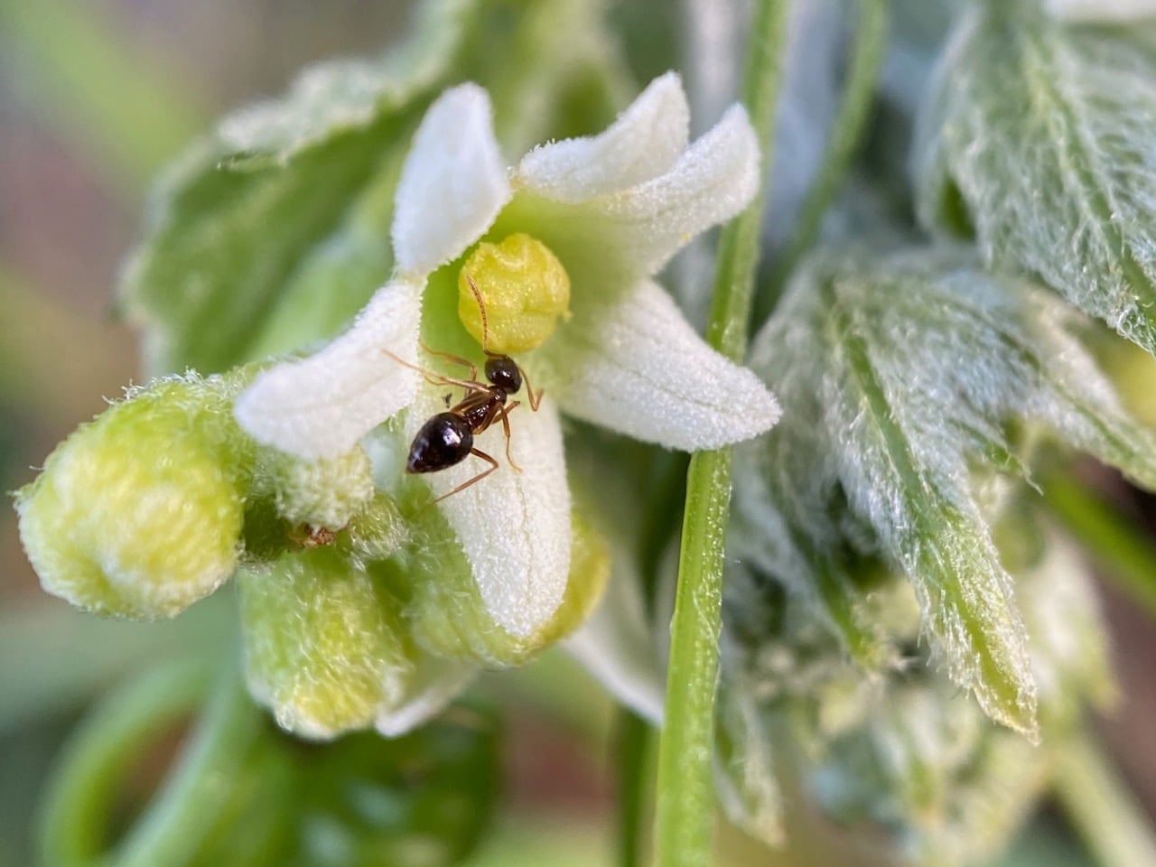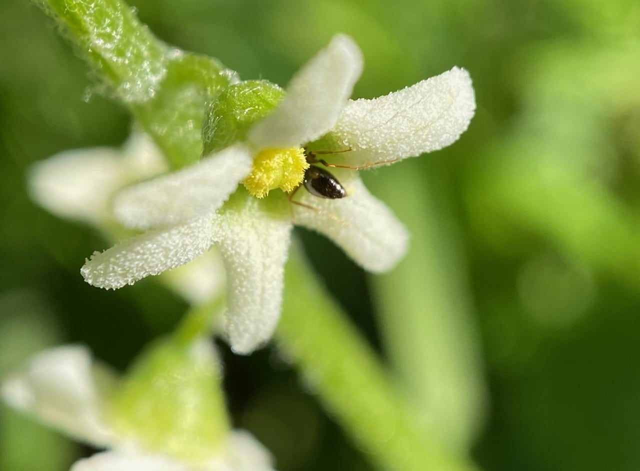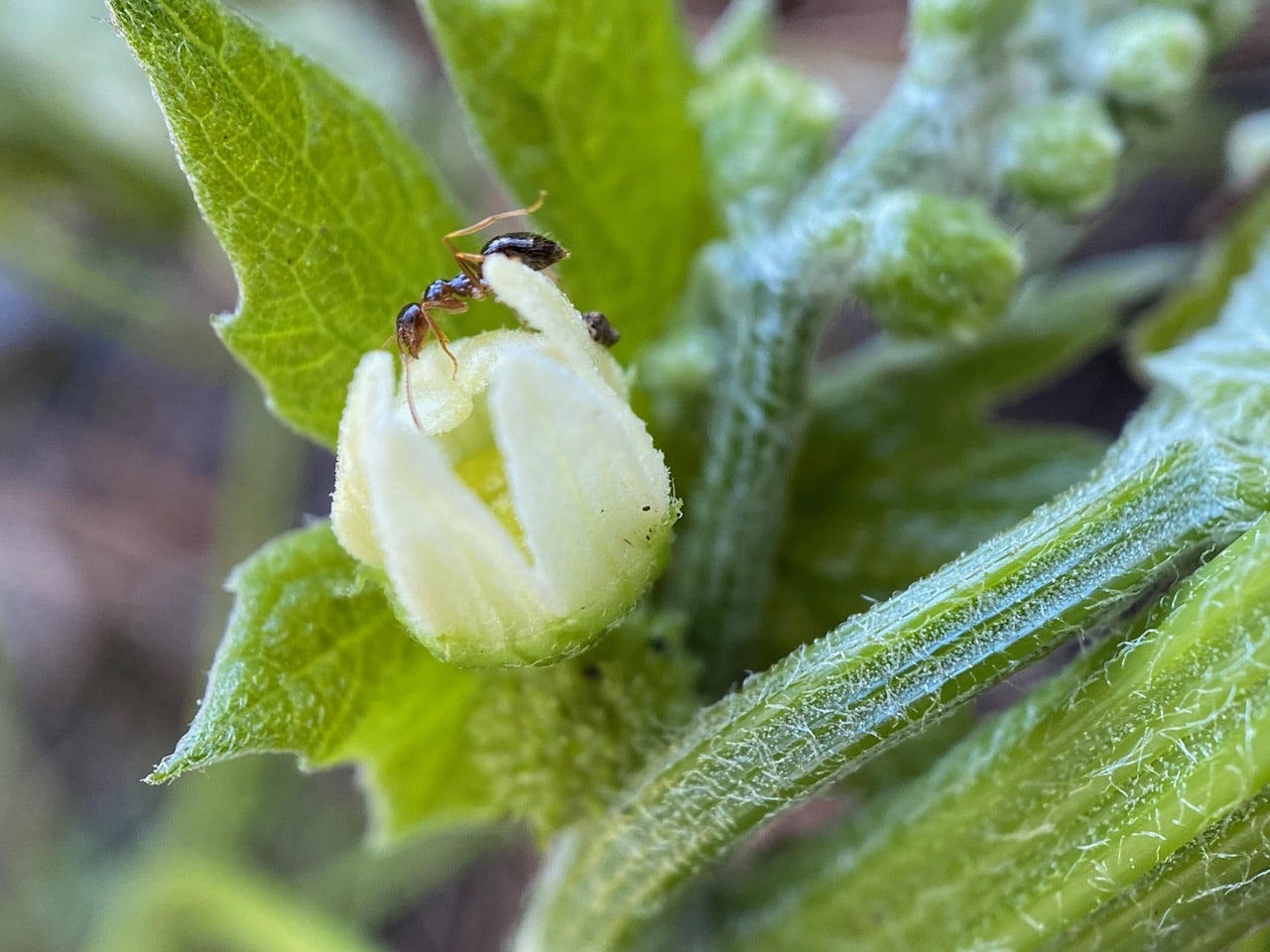 Another American Winter Ant has entered the cup-shaped corolla base of another male flower to access nectar. In doing so, its body is likely to come into contact with the pollen from the anthers.