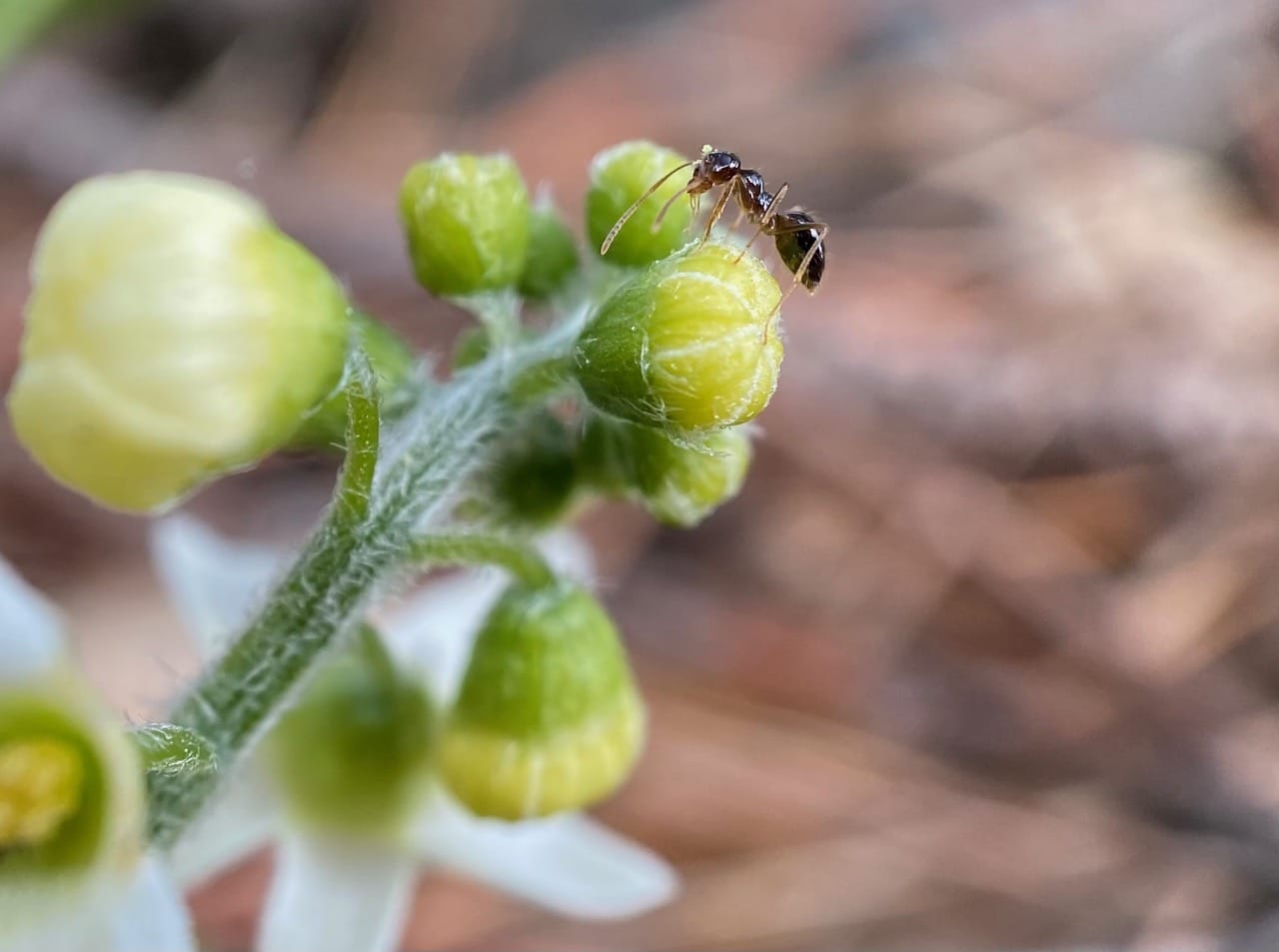 There is busy traffic of the American Winter Ants on this male Marah inflorescence. Many ants emerge from the flowers with their bodies, especially the heads, covered with pollen.