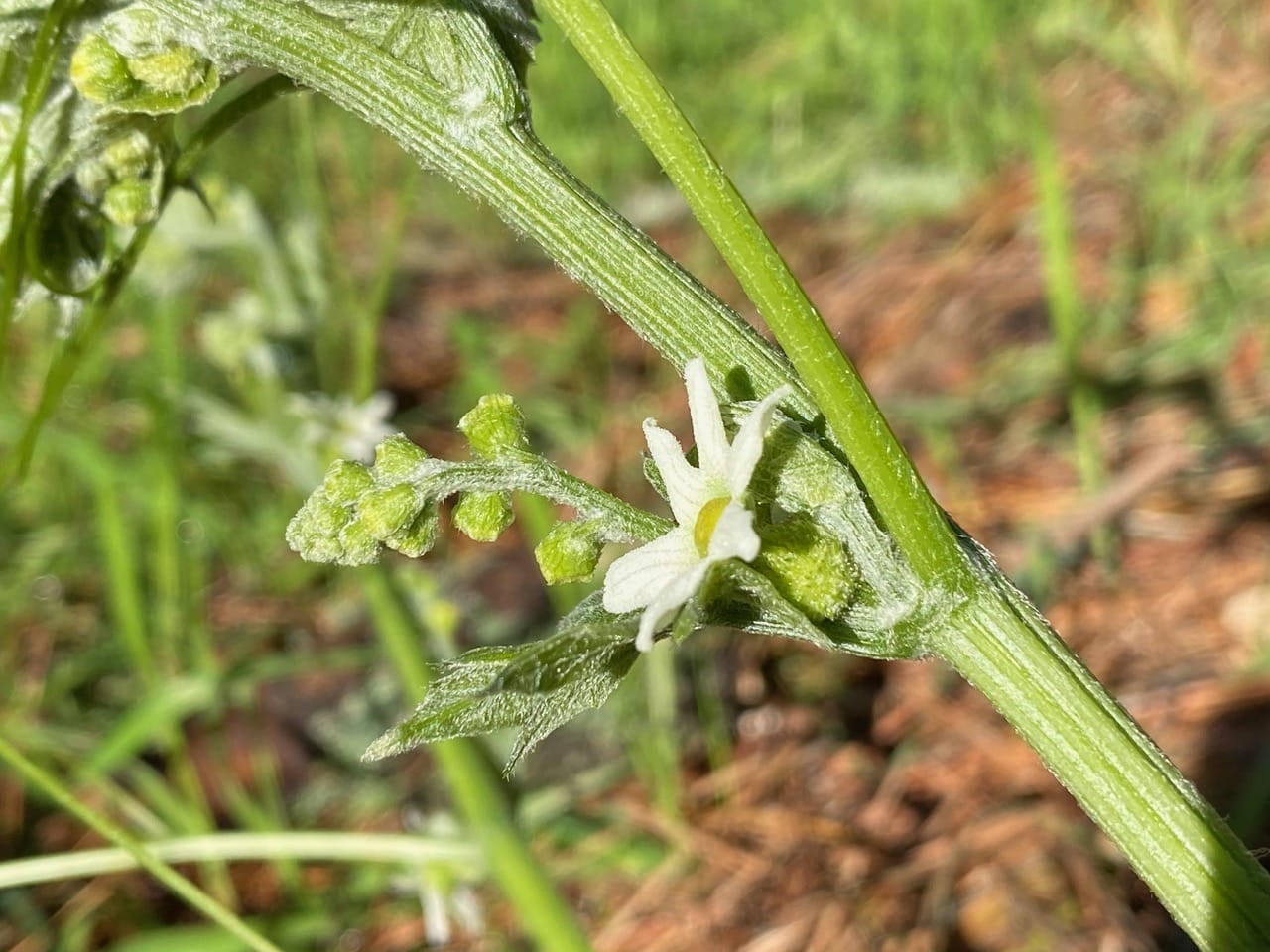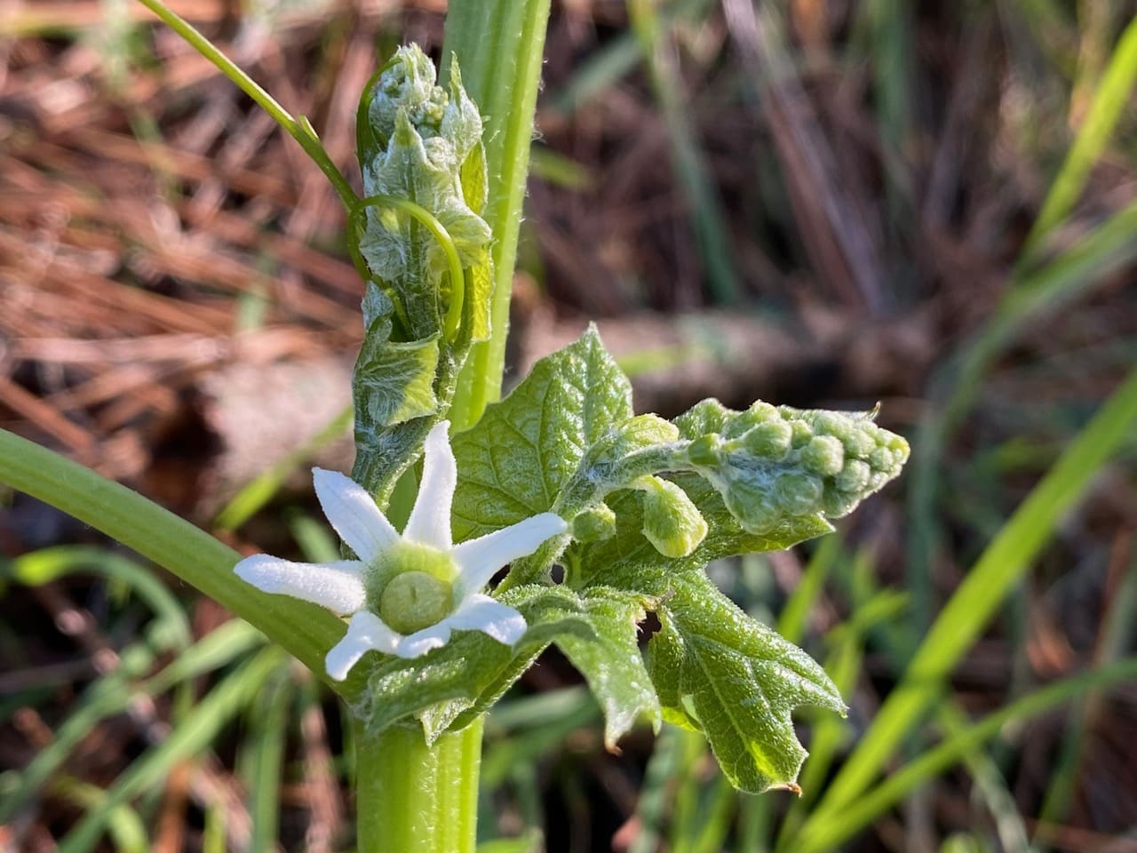 Here’s another female flower at a leaf axil. The adjacent male flowers are still in tight buds. Is this a way Marah prevents self-pollination?