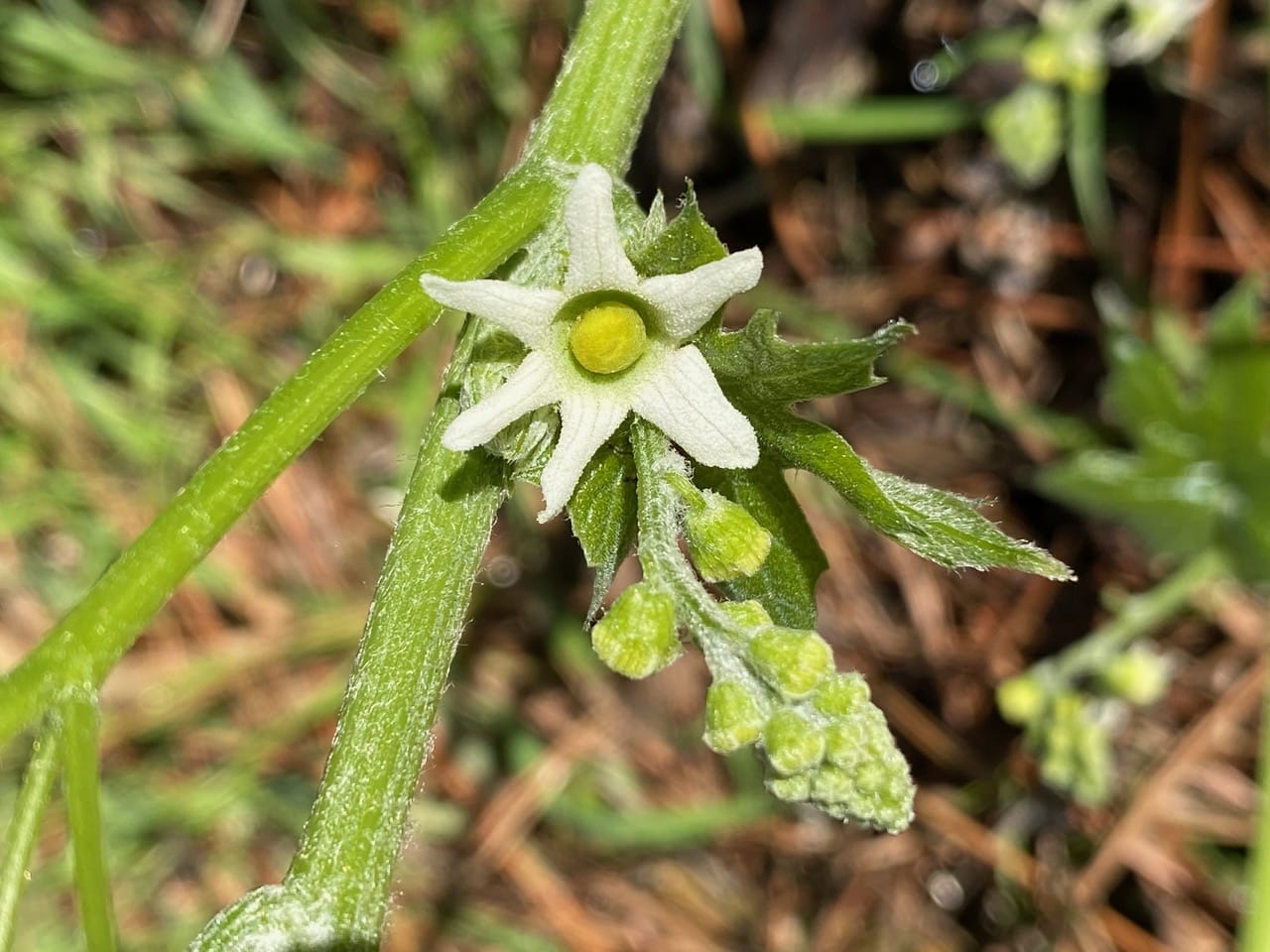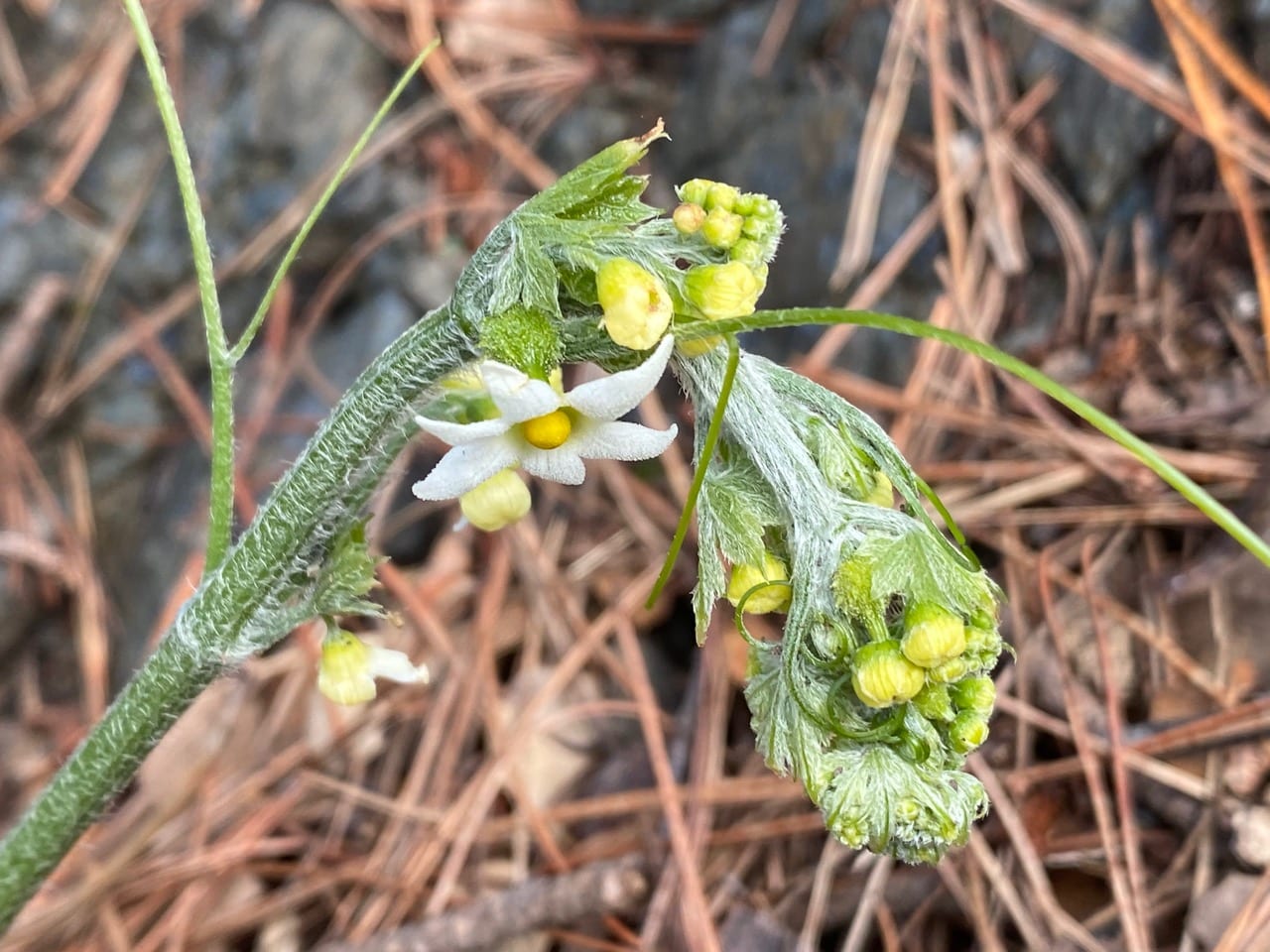 I easily locate the robust Coast Manroot, Marah oregana under the Monterey Pines by Sanborn Drive. Much to my delight, it has started to bloom! The first to open up are the solitary female flowers at the leaf axil below the inflorescence bearing the male flowers. See the fuzzy green ovary under the corolla of the female flower?