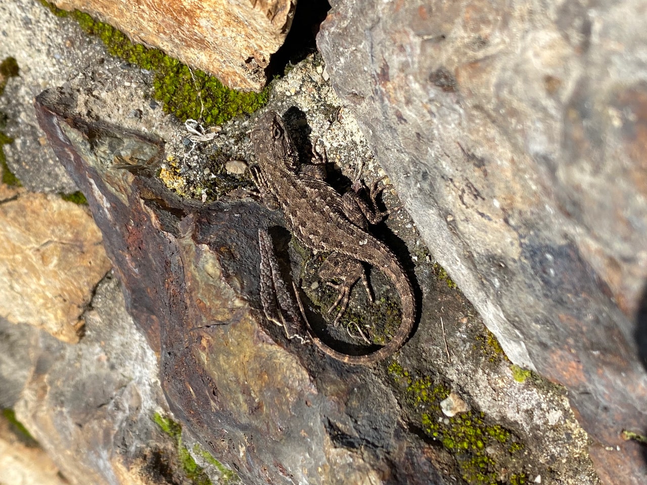 Just a few steps further, I find a young Western Fence Lizard basking on a narrow ledge of the stone wall. Is it out of brumation (reptile version of hibernation) already?