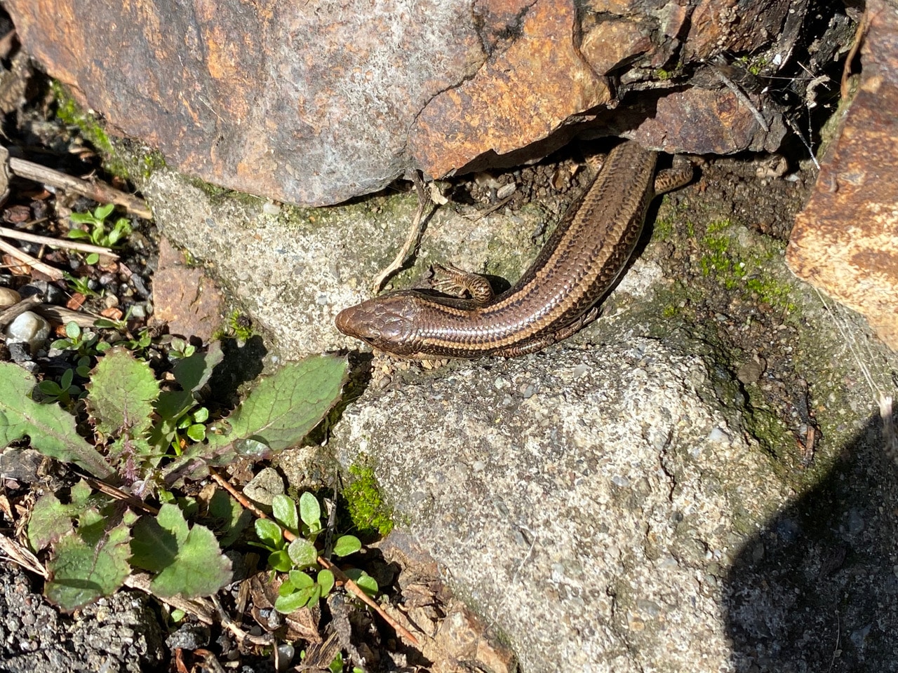 Then slowly it stretches its whole body out on the rock to take in the sun, ignoring my presence. Note its smooth scales and tiny limbs – rather snake-like overall. Too bad I don’t get to see its tail, so can’t tell if it’s an adult or juvenile.