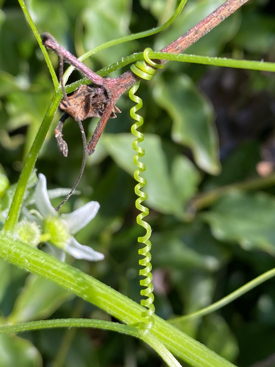Hey, look at that perfect spring-like tendril on the Oregon Marah. It has successfully latched on to an old vine. See the middle section where the coiling is reversed?