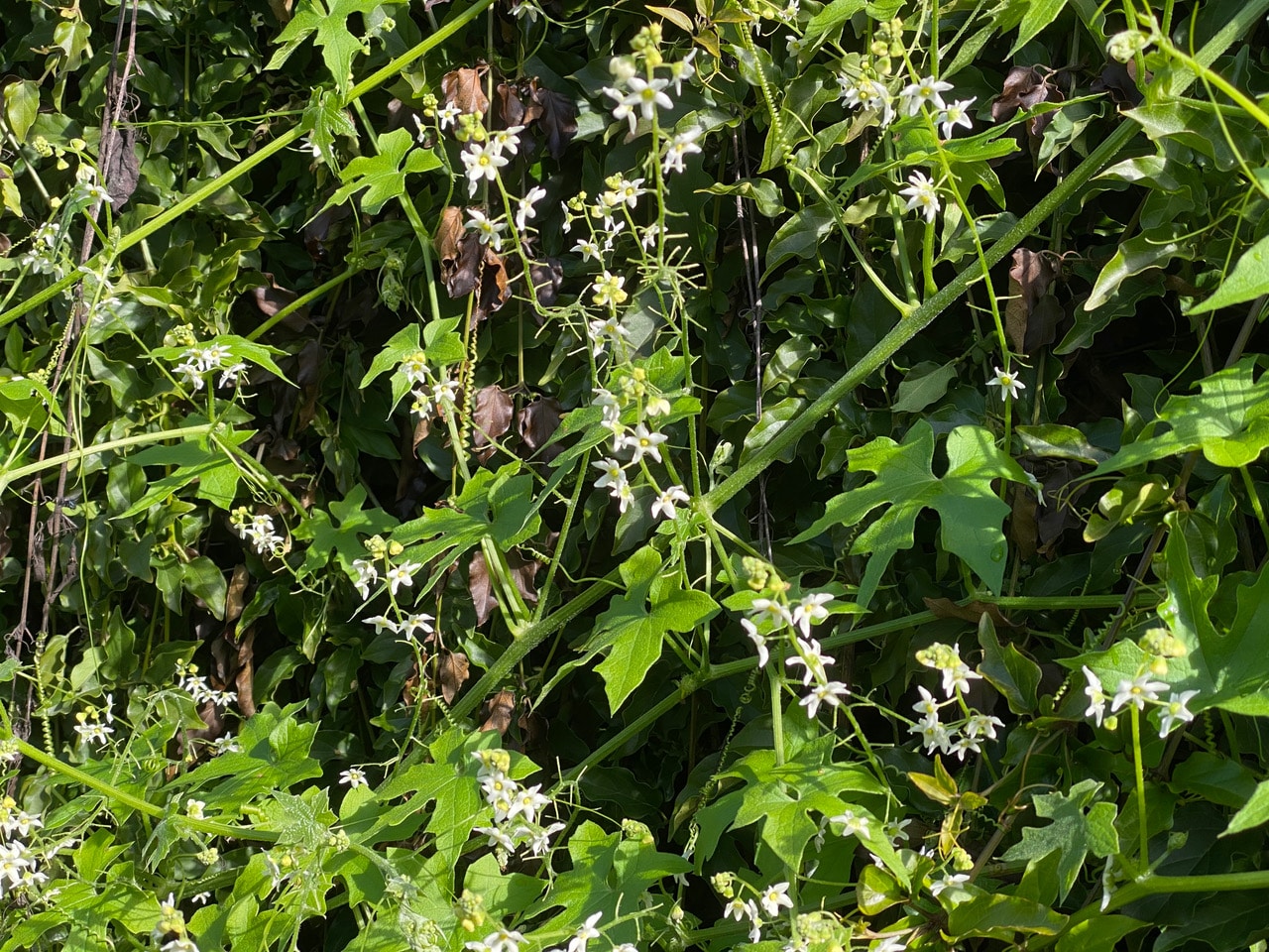 The Oregon Manroot (Marah oregana) sprawling on the rock wall is blooming profusely.