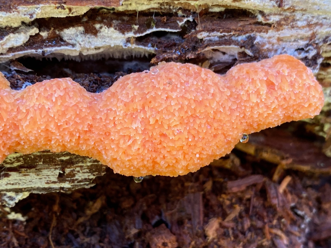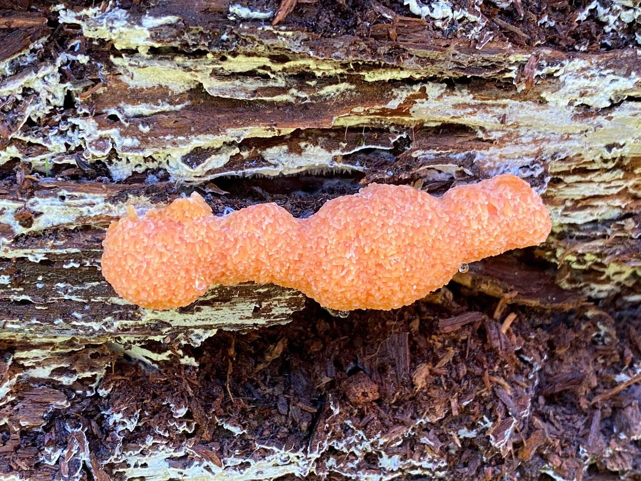 There’s something unfamiliar on another disintegrating log. I think it is a slime mold, not a fungus. iNaturalist has identified it as the Red Raspberry Slime Mold, Tubifera ferruginosa.