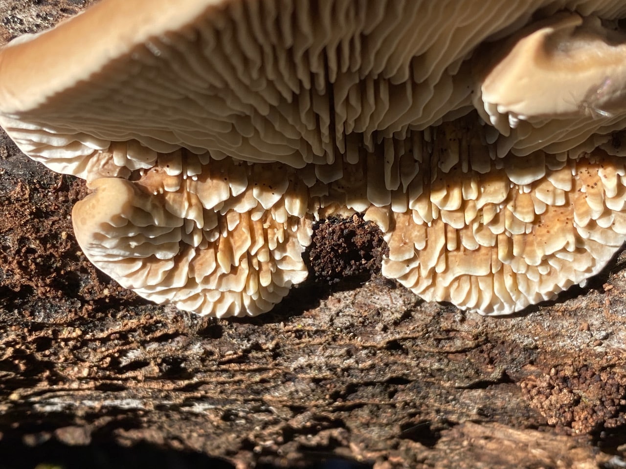 I peek under the caps to check for gills or pores. What sturdy gills these are! iNaturalist has helped identify the fungus as Gilled Polypore, Trametes betulina. What an oxymoron of a name – gilled polypore!