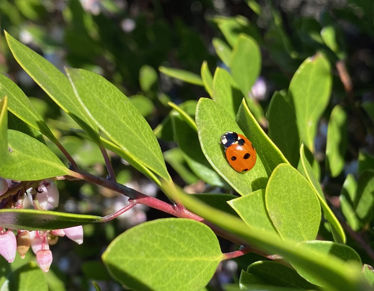 A Seven-spotted Ladybeetle, Coccinella septempunctata (family Coccinelidae) shows up conspicuously on a Manzanita leaf. It seems to be enjoying the morning sun.