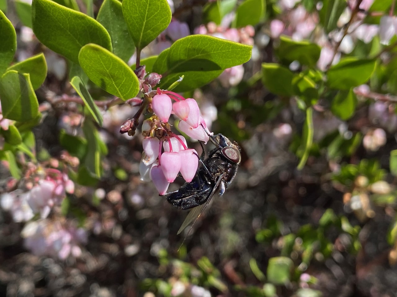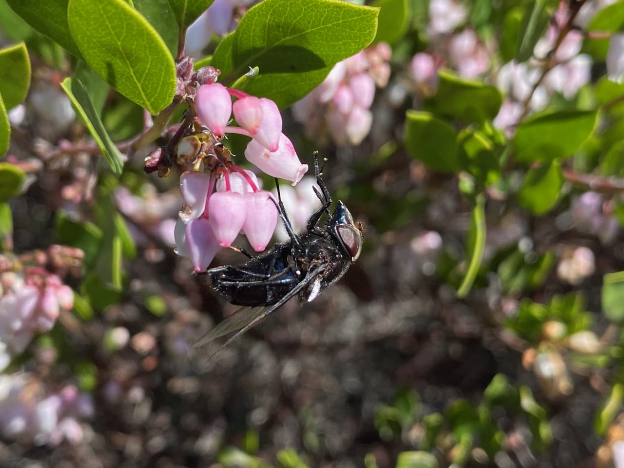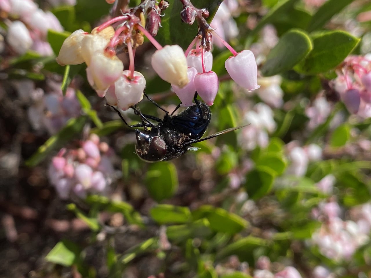 A Purple Bromeliad Fly, Copestylum violaceum (family Syrphidae) lands on a cluster of Manzanita flowers next to me. Note the hover fly’s pointy “snout”. I am intrigued by the fly’s feeding mechanism.