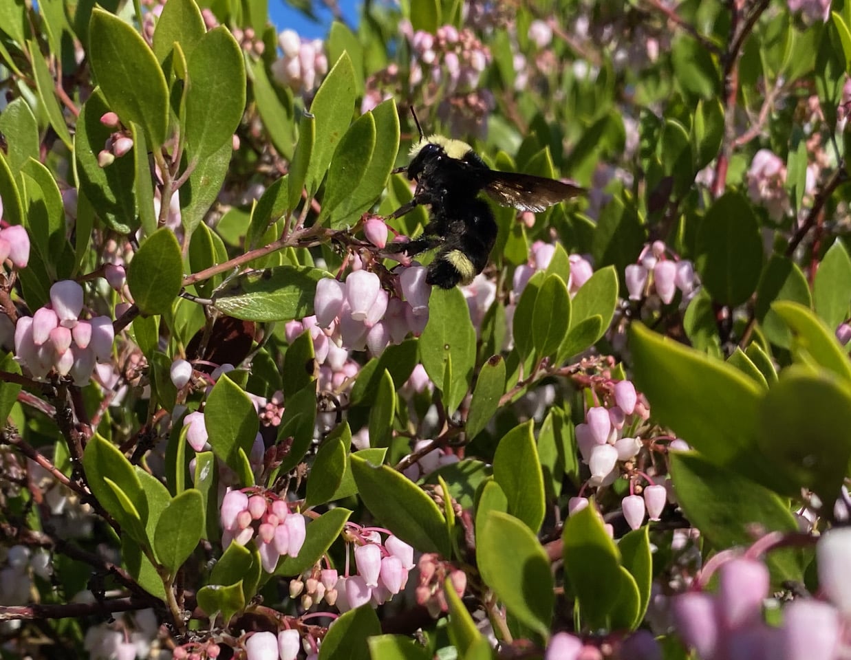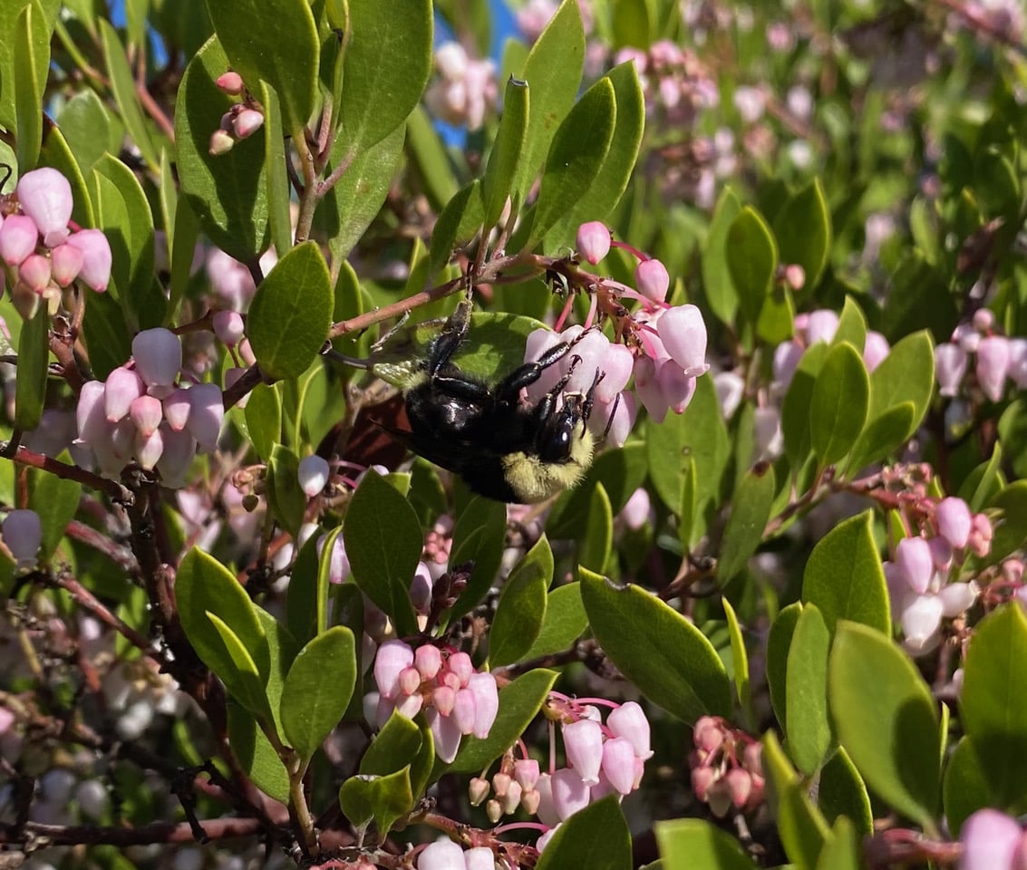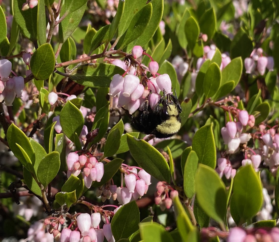 A large Yellow-faced Bumble Bee, Bombus vosnesenskii (family Apidae) lands on a cluster of Manzanita flowers. From her large size, I have no doubt that she is a queen. She seems to have difficulty getting a firm hold of the small flowers. She might also be inexperienced, fresh out of hibernation.