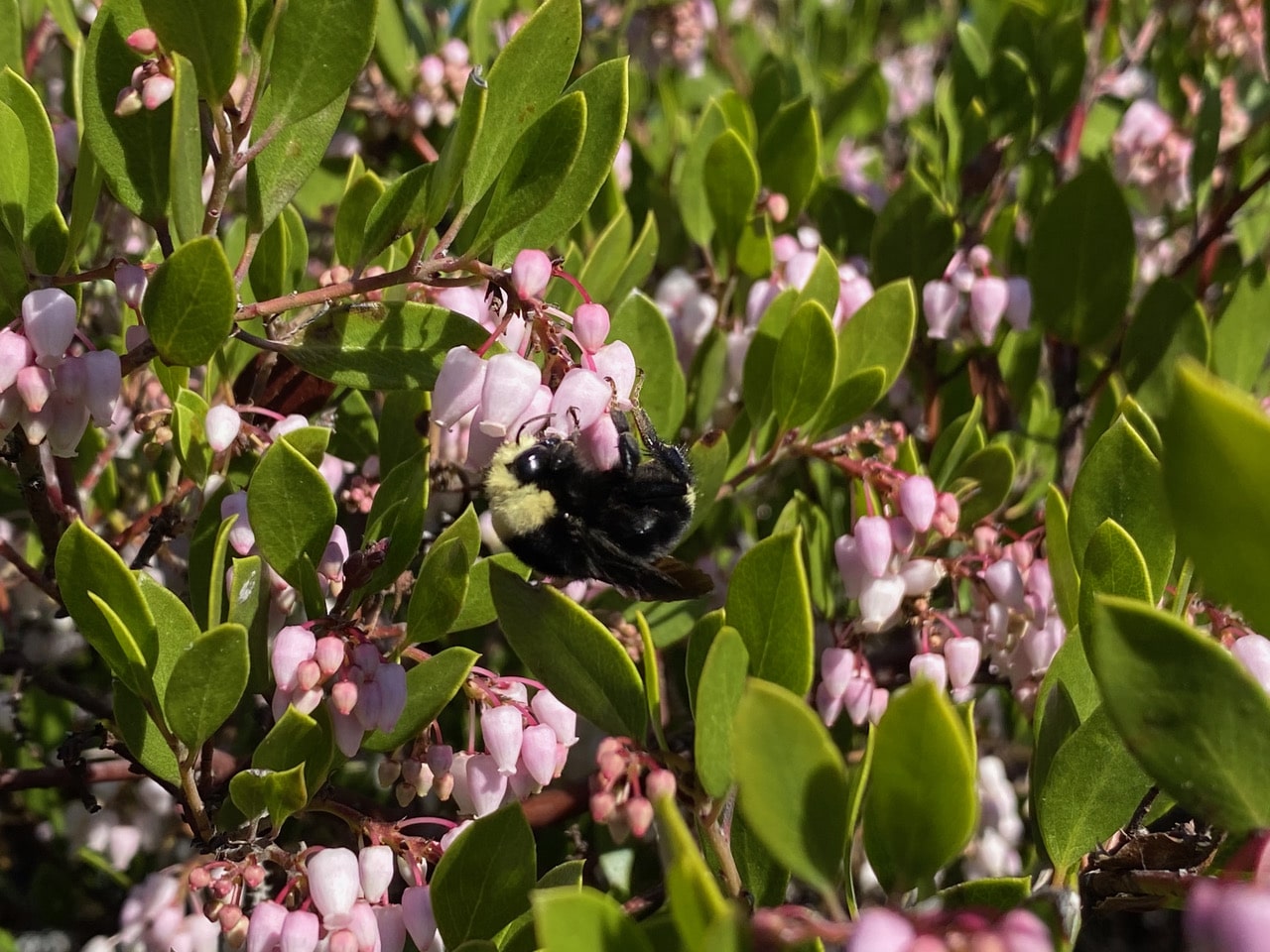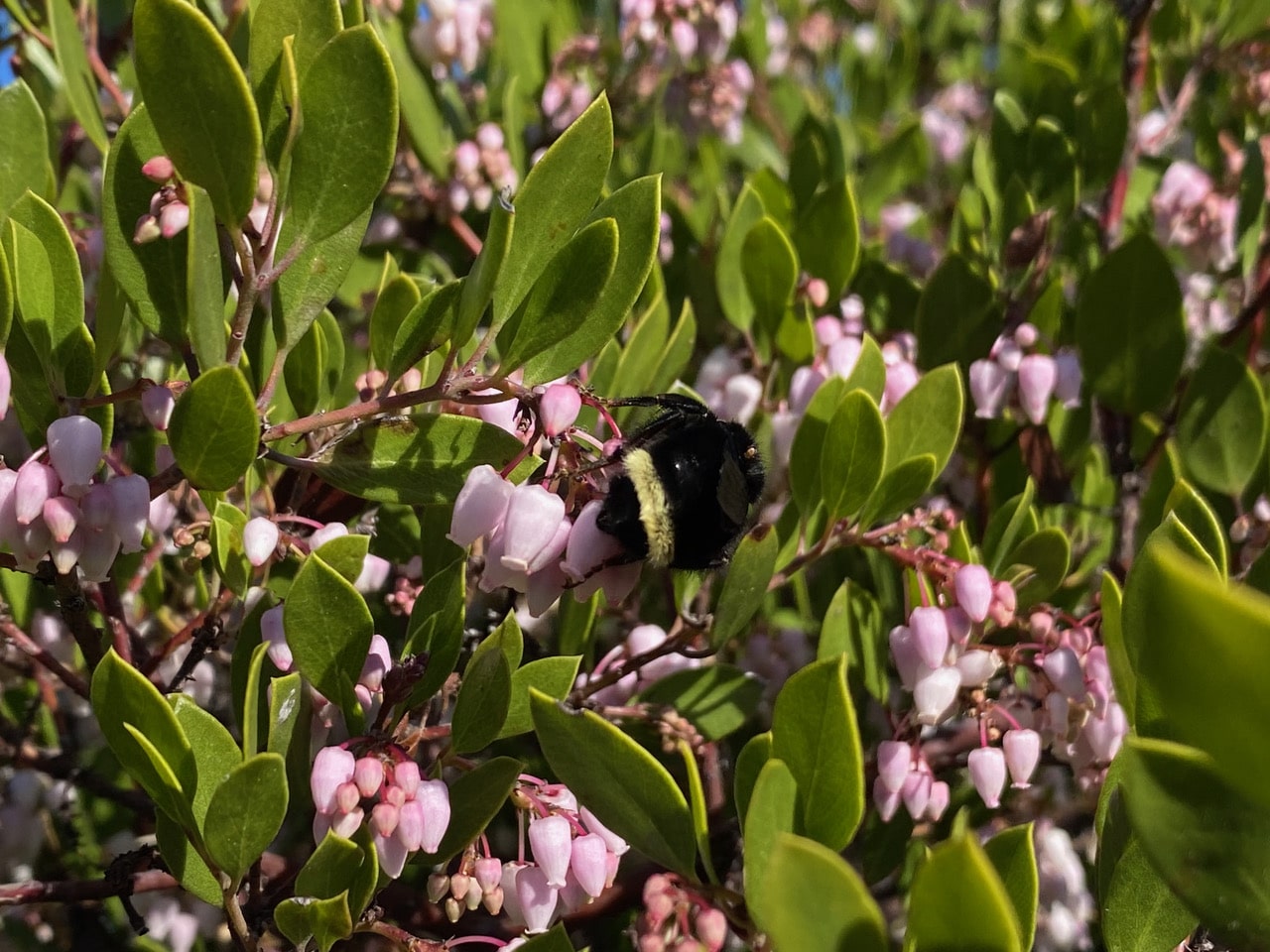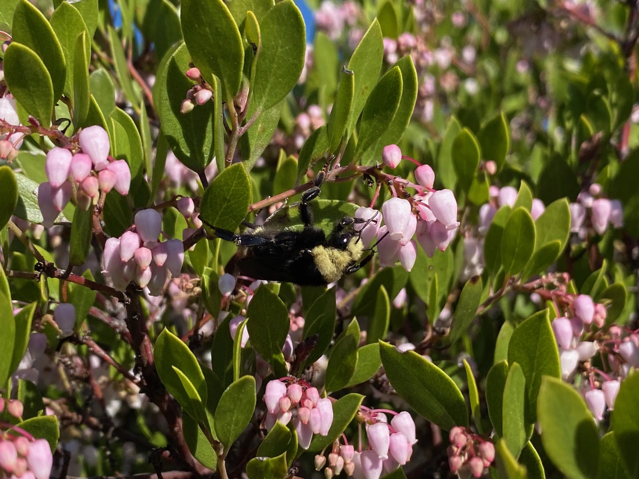 A large Yellow-faced Bumble Bee, Bombus vosnesenskii (family Apidae) lands on a cluster of Manzanita flowers. From her large size, I have no doubt that she is a queen. She seems to have difficulty getting a firm hold of the small flowers. She might also be inexperienced, fresh out of hibernation.