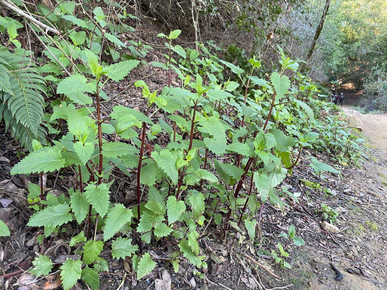 The California Bee Plant, Scrophularia californica is growing tall along the trail. The perennial herb is easily recognized by its square maroon stems, and triangular, toothed leaves. When in bloom the small, oddly shaped flowers are an excellent nectar source for a diversity of pollinators.