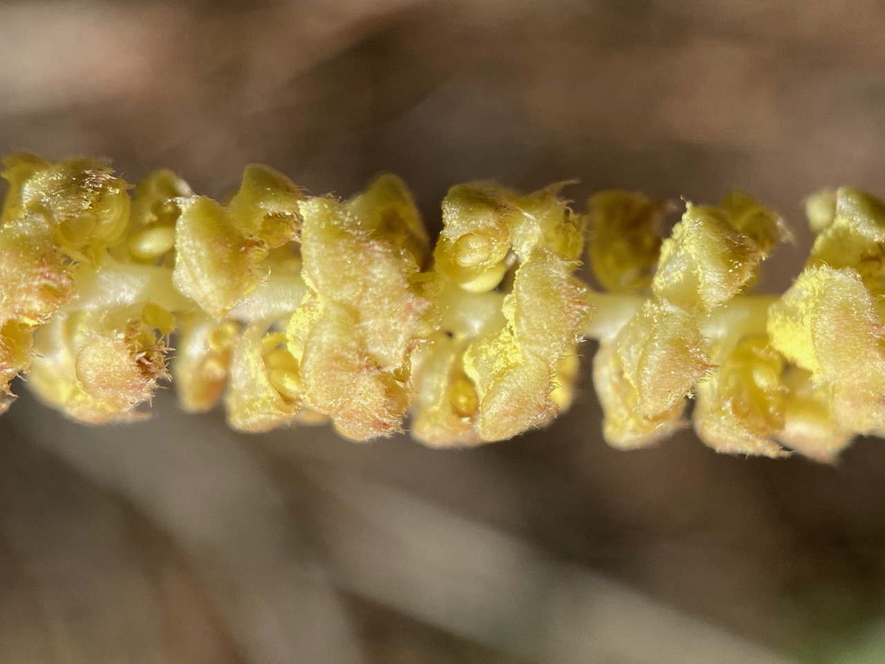 Close examination of a male catkin reveals numerous anthers packed beneath each downward curving bract.