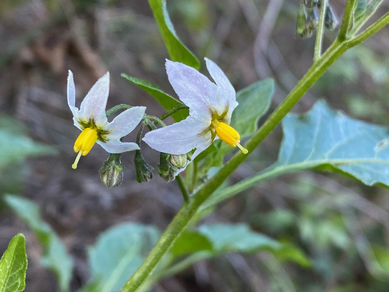 A Forked Nightshade, Solanum furcatum (family Solanaceae) is blooming in the dappled shade along the trail.