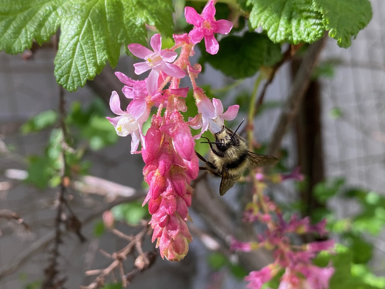This picture was taken in my own garden two days ago. The Ribes flowers are very popular with the Black-tailed Bumble Bees, Bombus melanopygus. The colony of Carpenter Bees, Xylocopa sp. living under the rafters of my house has become active recently. Those bees are frequent visitors to the Ribes flowers too, sometimes engaging in a chasing game with the bumble bees.
