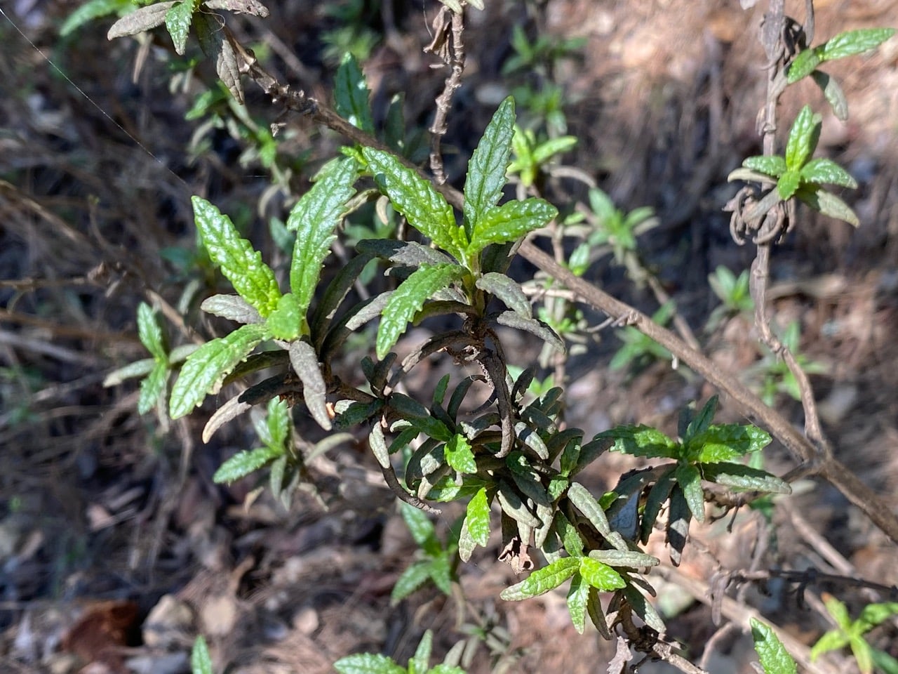 Bush Monkey Flower, Diplacus aurantiacus has sprouted bright green leaves at every branch tip and stem node to replace the dark, spent leaves from last year. Life is ready for renewal!