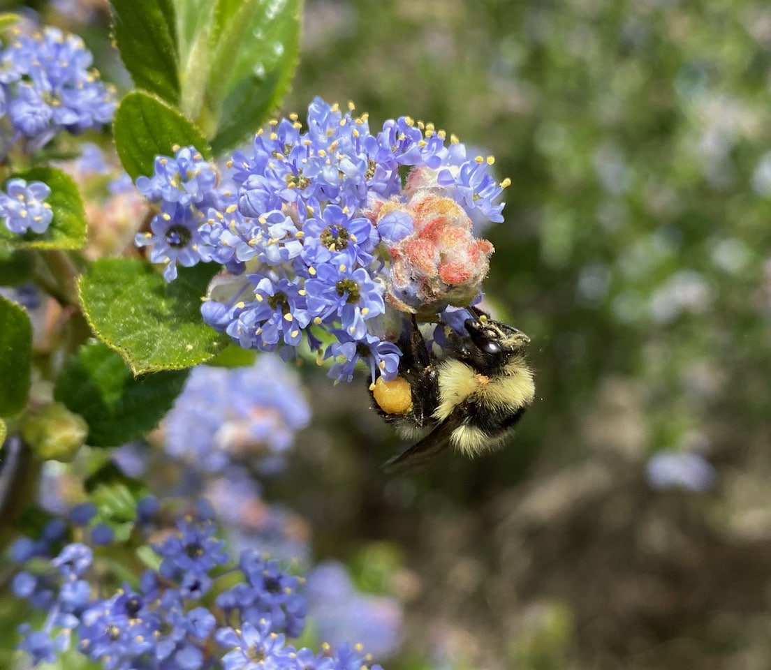 To collect pollen, the bee simply shimmies its way through the Ceanothus flowers. Even without direct contact, the loosened pollen grains are attracted to the hairs of the bee by electro-static force. The bee then grooms the pollen into its corbiculae. Occasionally I hear a high-pitched buzz from the foraging bee. Not sure what that is about. Pure joy and exuberance?