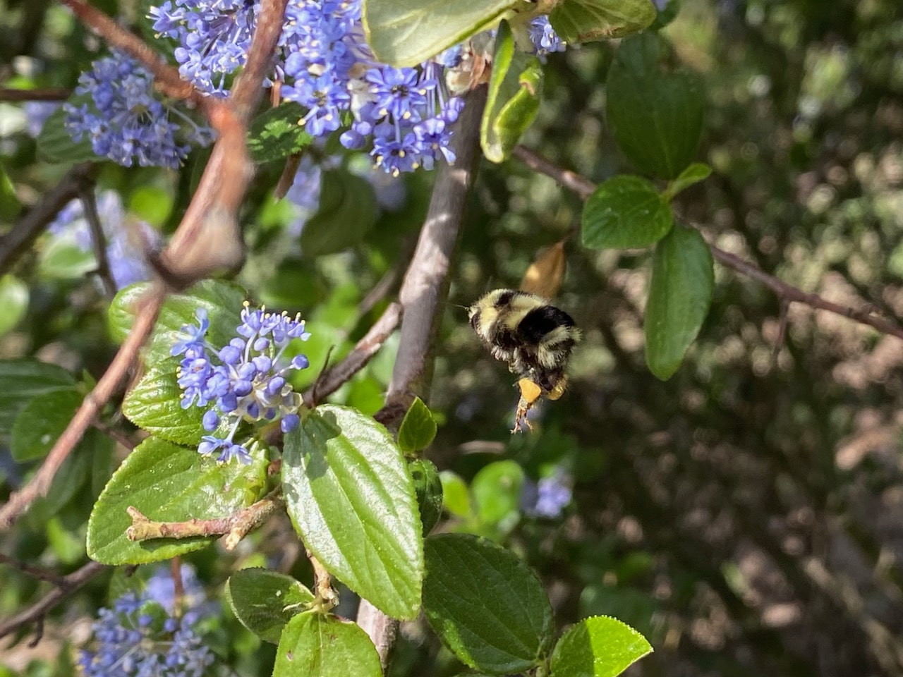 Judging from their small size, most of the Black-tailed Bumble Bees foraging on the Ceanothus today are workers. Some colonies must have been successfully established in the vicinity! Usually the queen bees, much larger in build, are the first to appear in early spring. They are the only ones to over-winter while the rest of the colony dies last year. Having been inseminated last fall, the new queens or gynes are fully equipped for reproduction. Freshly emerged from hibernation, a queen has to forage for herself, look for a good nesting site, usually an abandoned rodent hole. She prepares the nest and lays eggs. She has to nourish herself and her young when they hatch, a single mom responsible for establishing a new colony by herself. Once the first brood is produced, the queen becomes a stay-at-home mom to concentrate on egg laying, while the workers (all female) take over foraging and hive duties. Among the foraging bees, I see some distinctly small individuals. These are most likely the workers from the first brood hand raised by the queens themselves; as larvae they were probably not as well nourished as the regular broods raised by a team of workers.