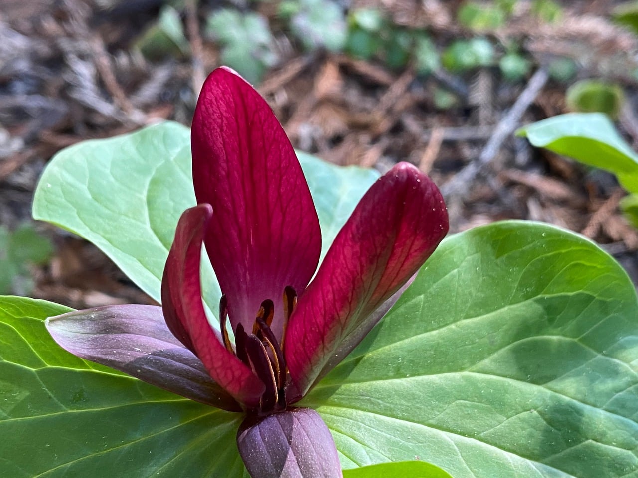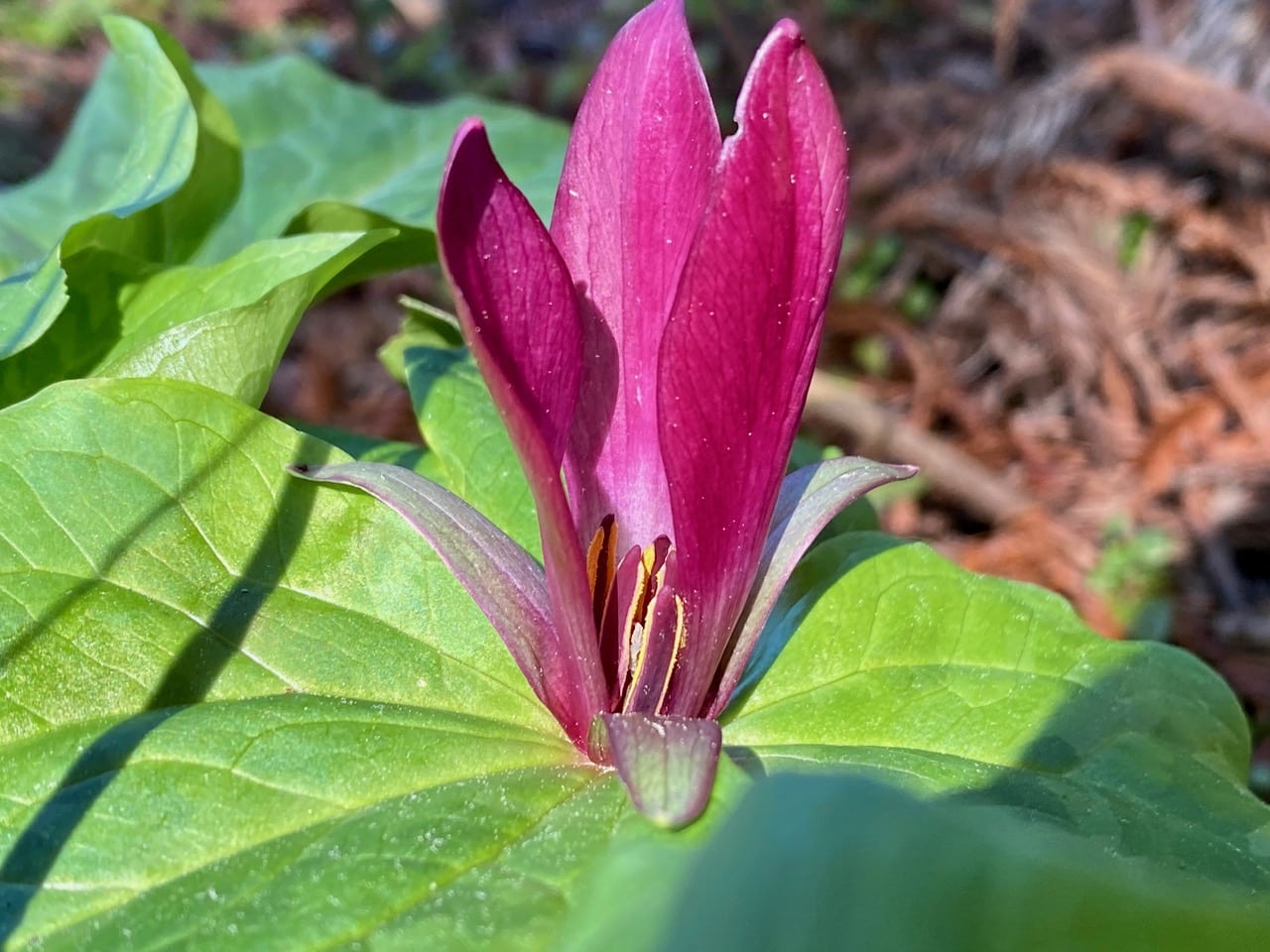 The name “trillium” incorporates the Latin word for three (“tri”), which refers to the three-part symmetry around which the plant parts are organized – in a single blossom there are three petals, three sepals, and likewise, the leaves (technically, bracts) also come three to a plant. Trilliums are divided into two groups, sessile or pedicellate. In the Giant Trillium, the flowers are sessile, meaning they are not subtended by a stalk or pedicel, but sit upright directly on the leaves. The floral structure is intriguing – large, erect, fleshy stamens surround a shorter, purplish, wrinkled pistil in the center. How are these flowers pollinated? From the literature, I gather that various species of trilliums are pollinated in different ways. Red trilliums that do not produce nectar are apparently pollinated by flies (Diptera) and beetles (Coleoptera). Their petals exude an odor that attract carrion flies and beetles which pollinate the flowers. Another source claims that white and drooping trilliums are pollinated by bumble bees and related insects. I have yet to evaluate these claims by my own observations. Since I started looking a few years ago, I have not found an insect on the trillium flowers at all.