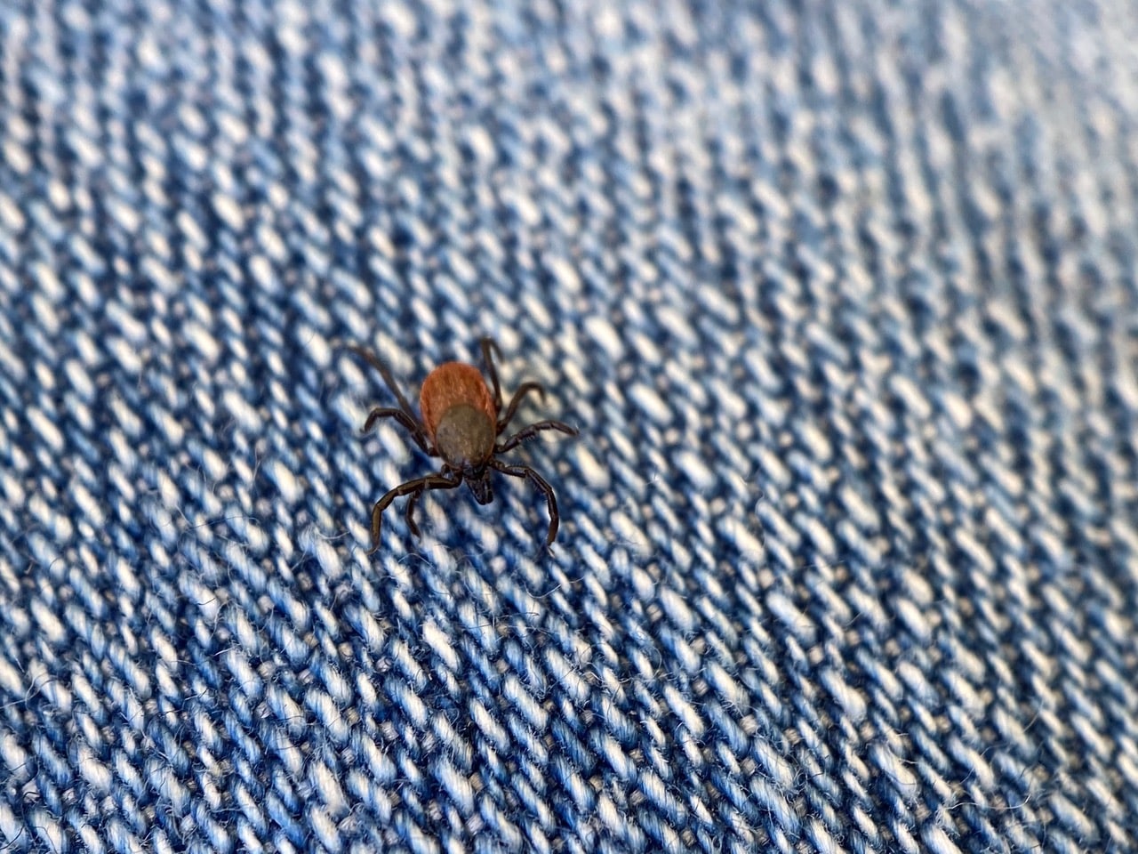 Uh-oh, an adult female Western Black-legged Tick is crawling on my jeans!