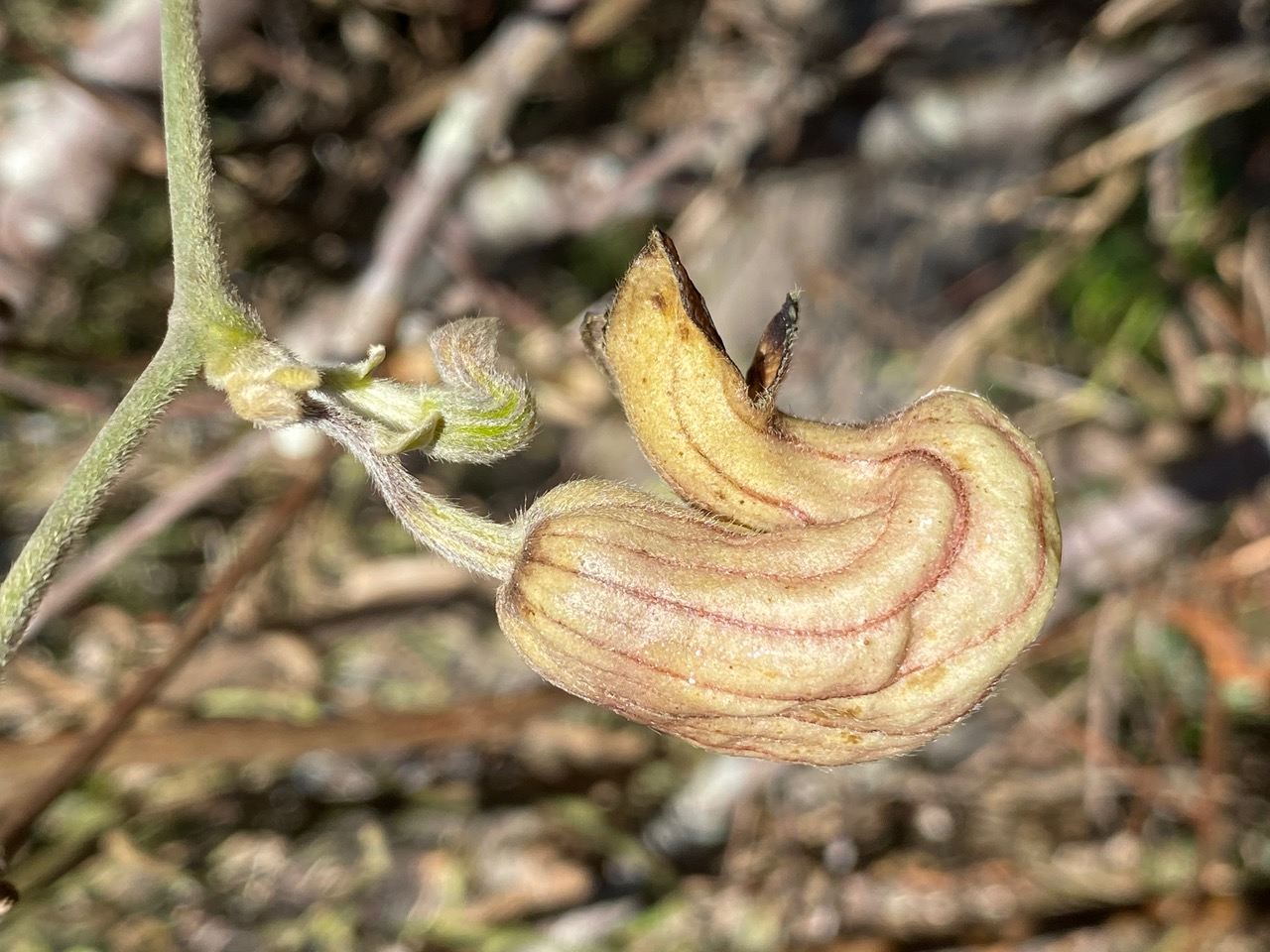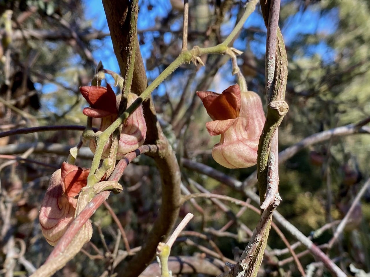 Over by the dormant Western Azalea, the California Pipevine, Aristolochia californica is in peak bloom, with numerous fully opened flowers hanging on the bare branches. With the sun out, a breeze brings a whiff of the flower’s odd odor. Often described as musty or mushroom-like, the scent reminds me of fresh, bloody meat.