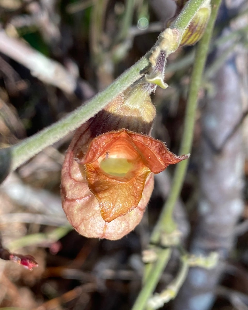 Instead of picking a fresh flower, I am re-posting these two pictures taken on 2/8/24. The flower was already damaged on the vine, with a big tear on the side showing the reproductive structures within. Note the yellow structure at the base of the flower (which is on the top end of the pipe-shaped flower as seen here). That consists of anthers embracing a large stigma in the center. The inner wall of the flower surrounding the reproductive structures is a deep maroon color, distinct from the rest of the interior. This colored tissue usually looks wet and grainy; it is where nectar is produced. Whoever (insect? bird?) broke into the flower was probably going after this sweet tissue!