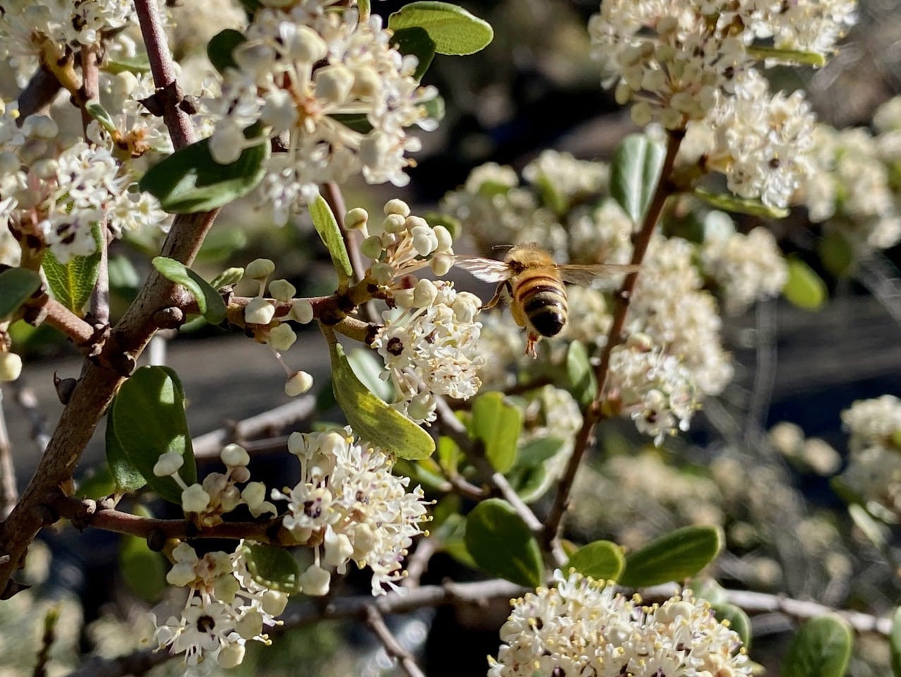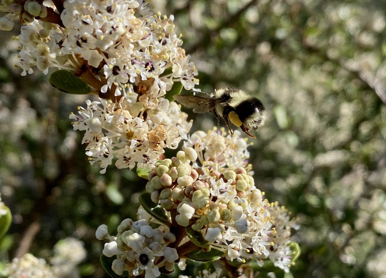 A new species of Ceanothus has come into bloom in the garden – the Buckbrush, Ceanothus cuneatus. The scent from its white flowers are intoxicating, and small worker Black-tailed Bumble bees, Bombus melanopygus (family Apidae) swarm over the blossoms with gusto.