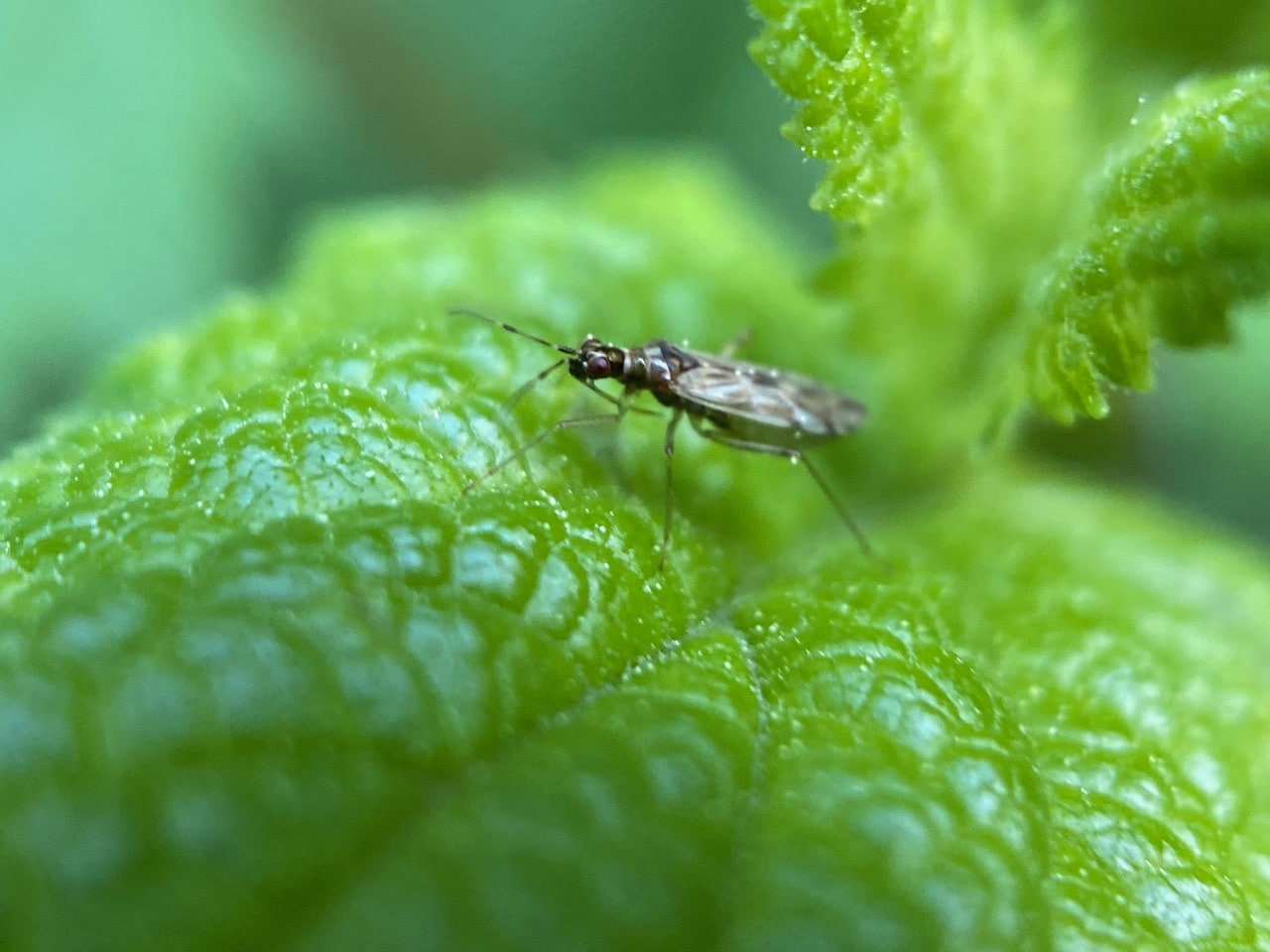 A tiny bug is lurking on the foliage of a Bee Plant, covered with scattered pollen grains. How do I know it is a bug? See the long piercing-sucking mouthpart (commonly referred to as a rostrum) that is folded under the body? That is a characteristic feature of a “true bug” in the order Hemiptera.