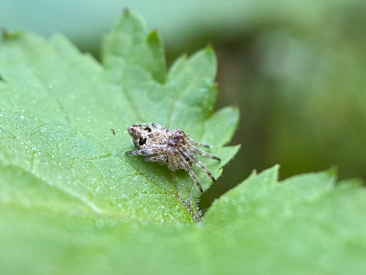 A couple of feet away on another Bee Plant, another Conical Trashline Orbweaver, Cyclosa conica is resting on a leaf. It is rather unusual to find these spiders away from their orb webs. This is a much paler individual with a less prominent cone-shaped protuberance on the abdomen. Note how these spiders generally rest with their front legs folded tightly, completely hiding their cephalothorax.