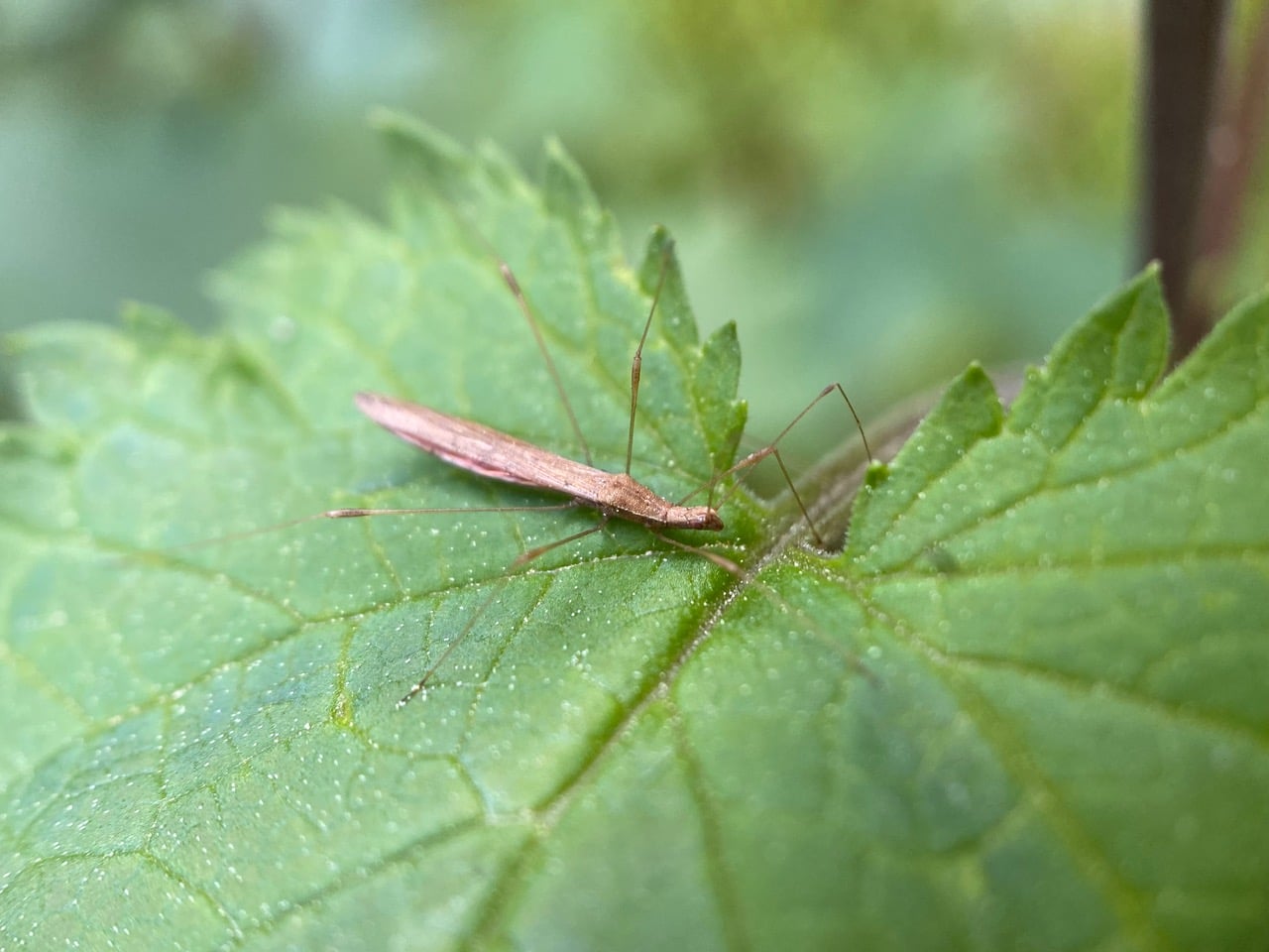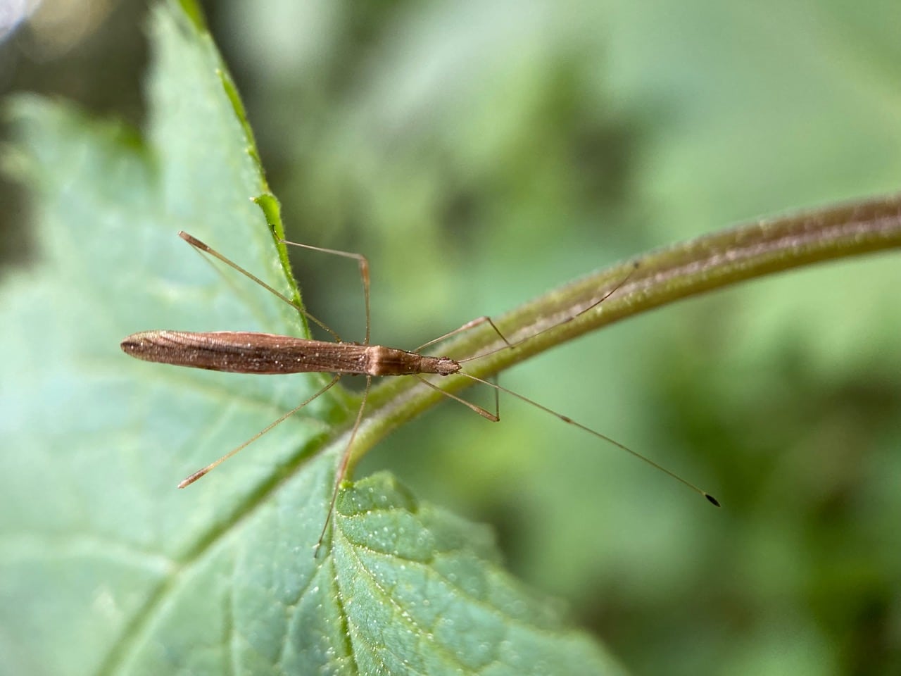 A small, slender, thread-legged insect is resting on a Bee Plant leaf. It is a Stilt Bug, Neoneides muticus (family Berytidae)