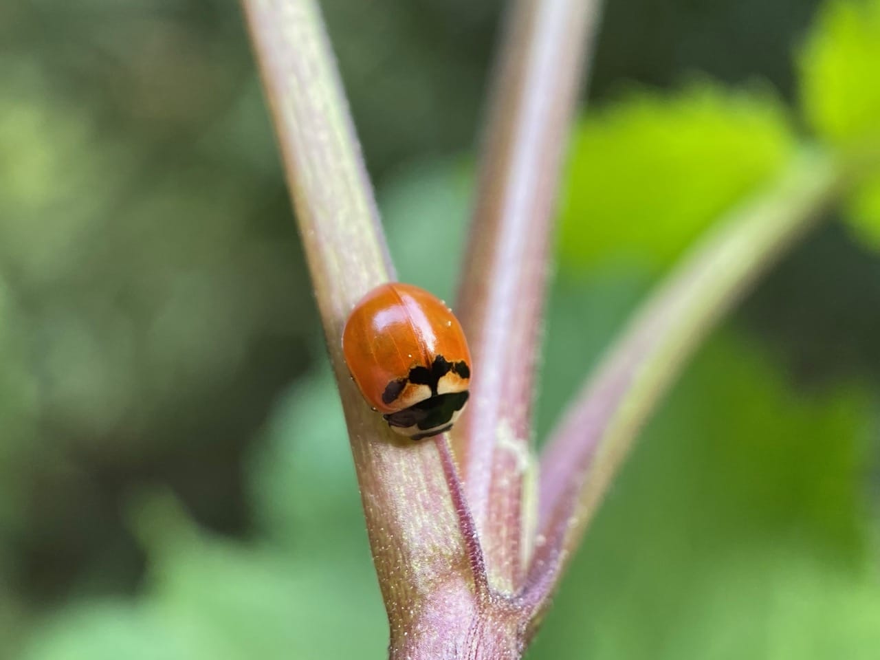 A Three-banded Lady Beetle, Coccinella trifasciata (family Coccinellidae) is resting near a leaf axil of a Bee Plant.