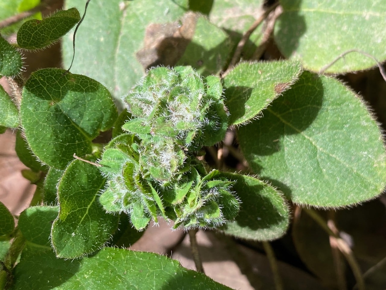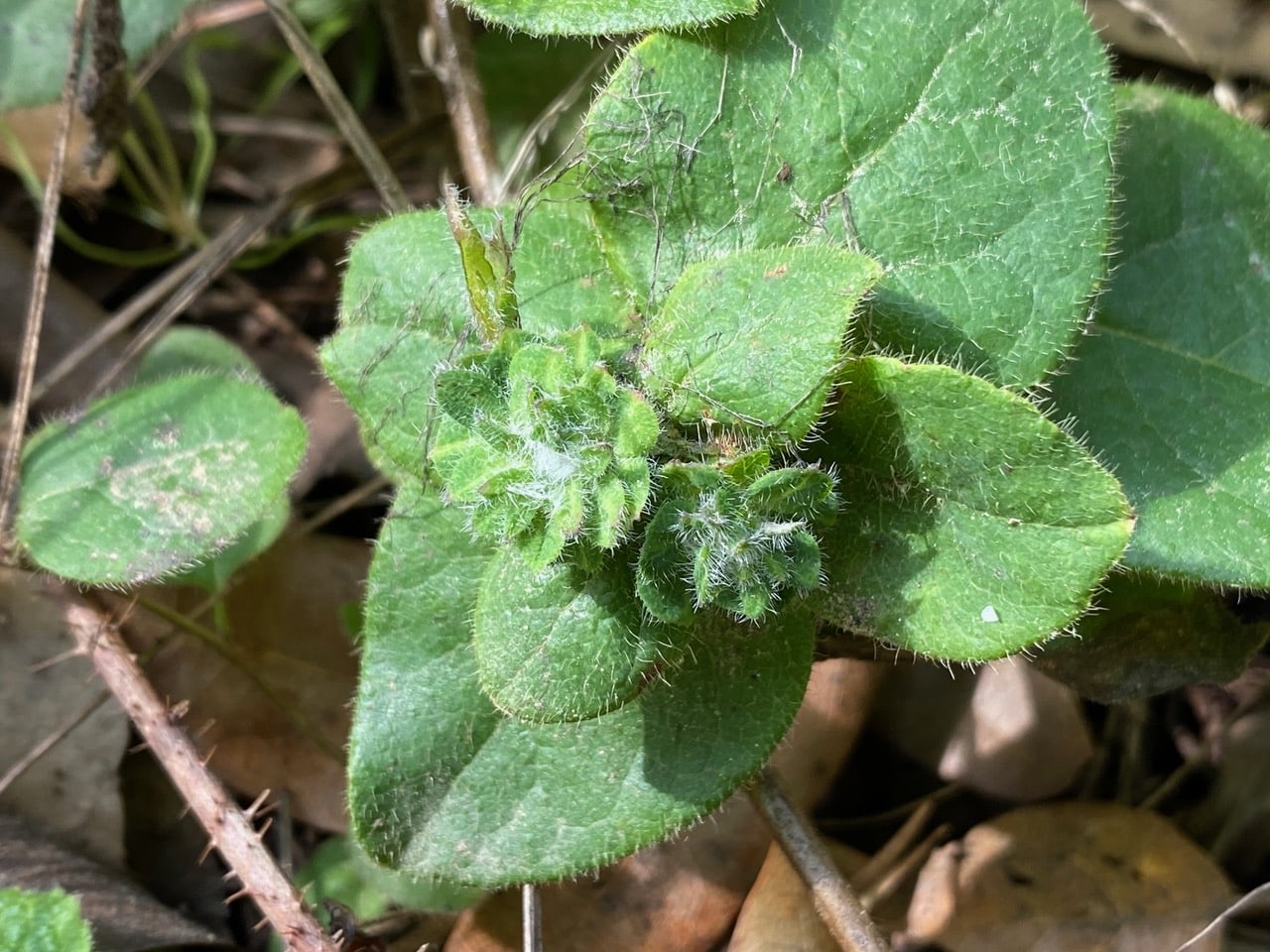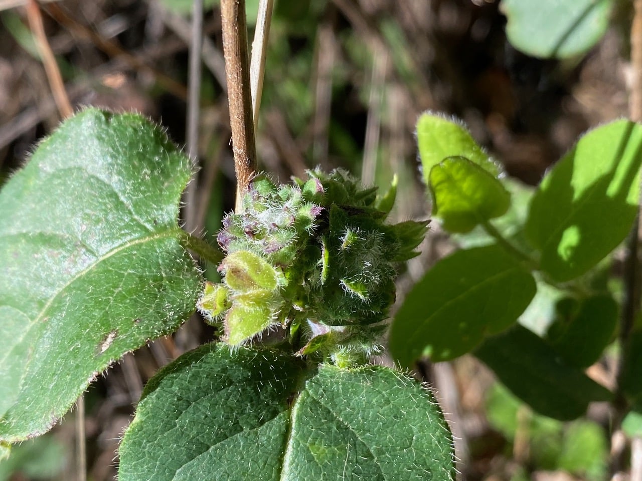 Draping over the trail bank, a California Honeysuckle, Lonicera hispidula has sprouted tender new shoots along its vines.