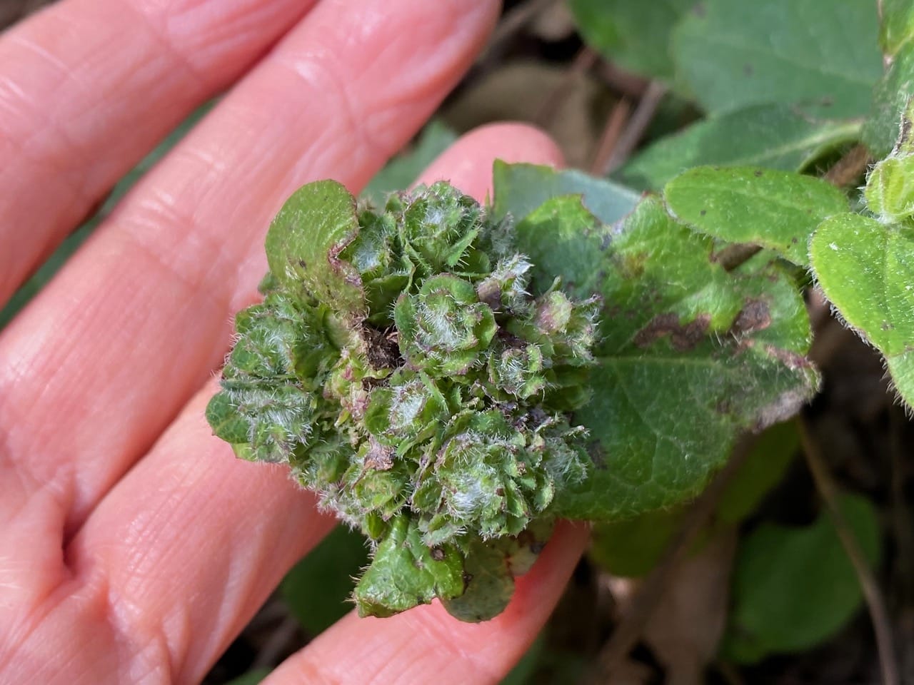 What delight to find this pom-pom of a bud gall on the honeysuckle! It brings back fond memories of helping Ron Russo rear the gall-makers from them. The Cabbage Bud Gall has since been named after Ron – Lonicerae russoi (family Cecidomyiidae). Ron is the author of the Field Guide to Plant Galls of California and Other Western States.