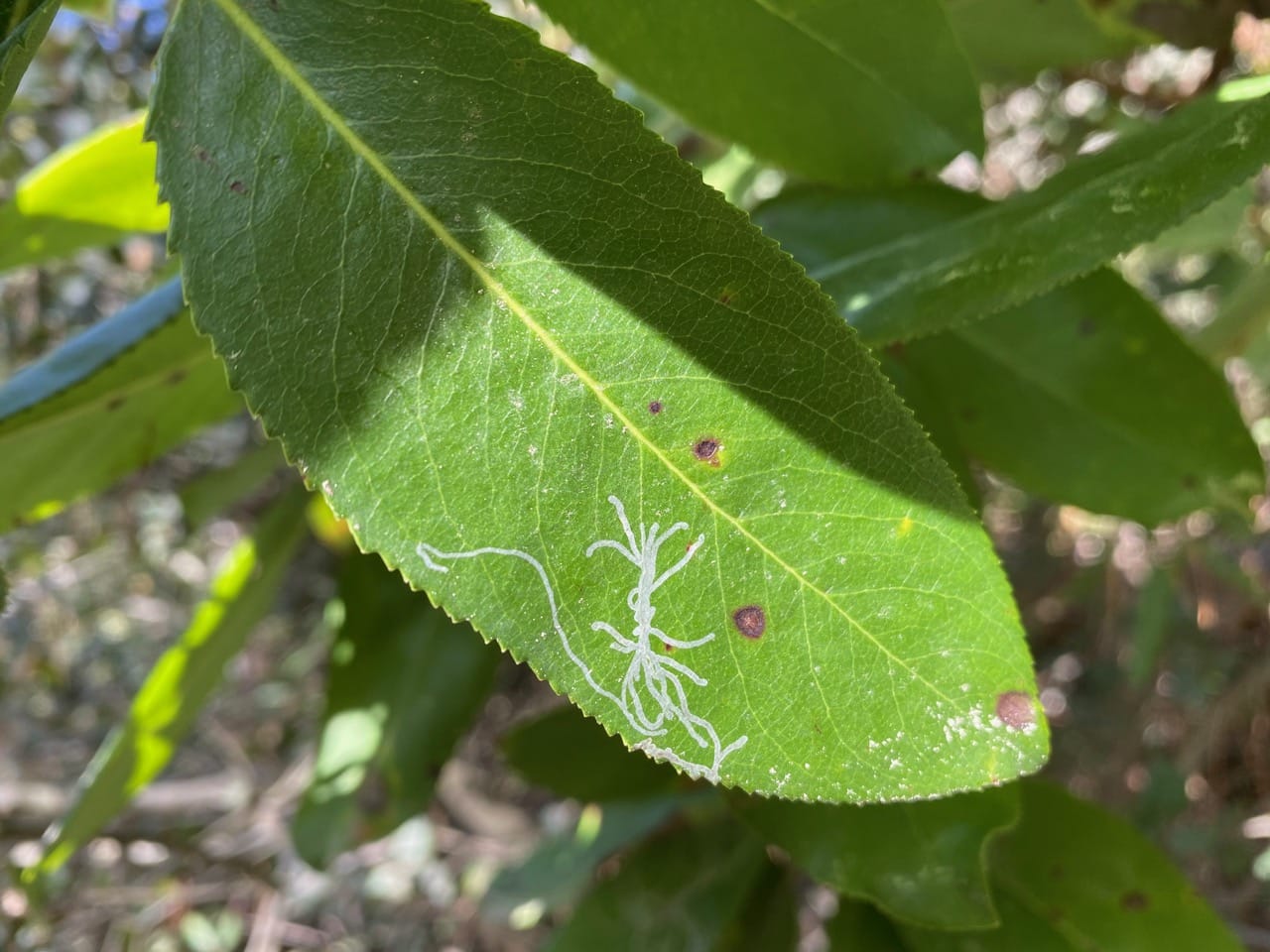 Here’s a madrone leaf that has those lines all over it. A closer inspection tells me that these are leaf mines.