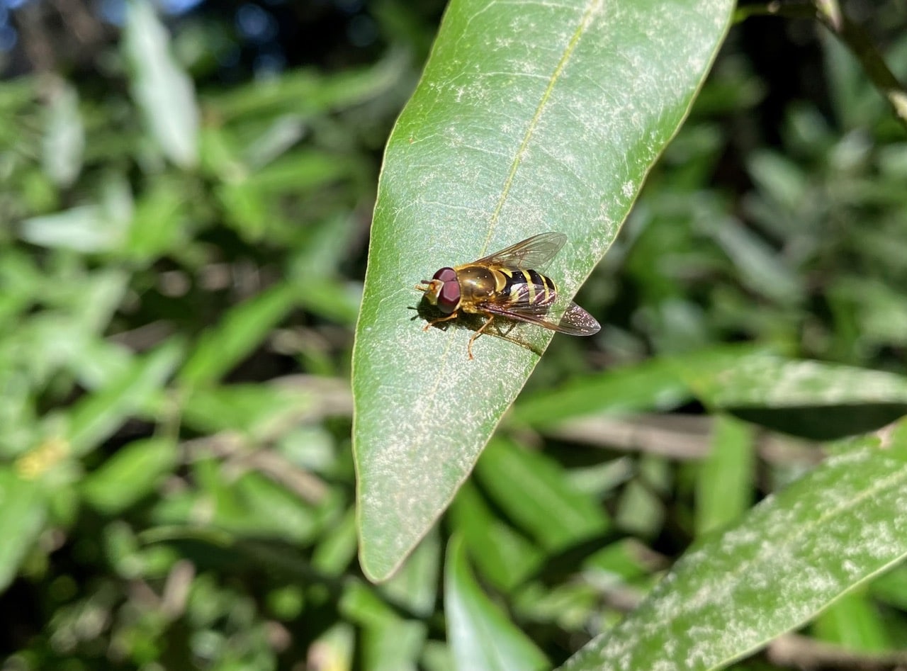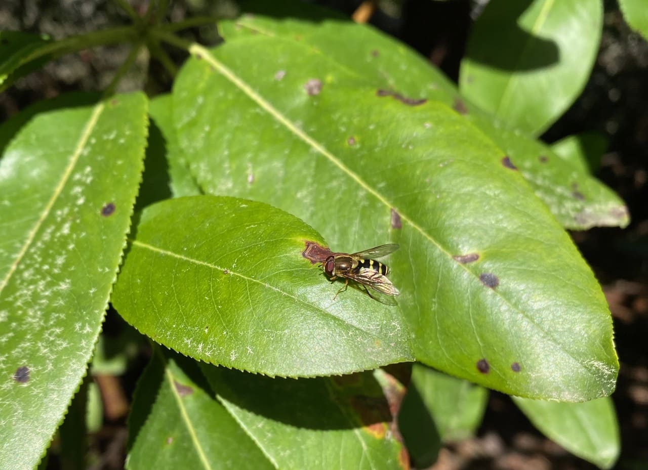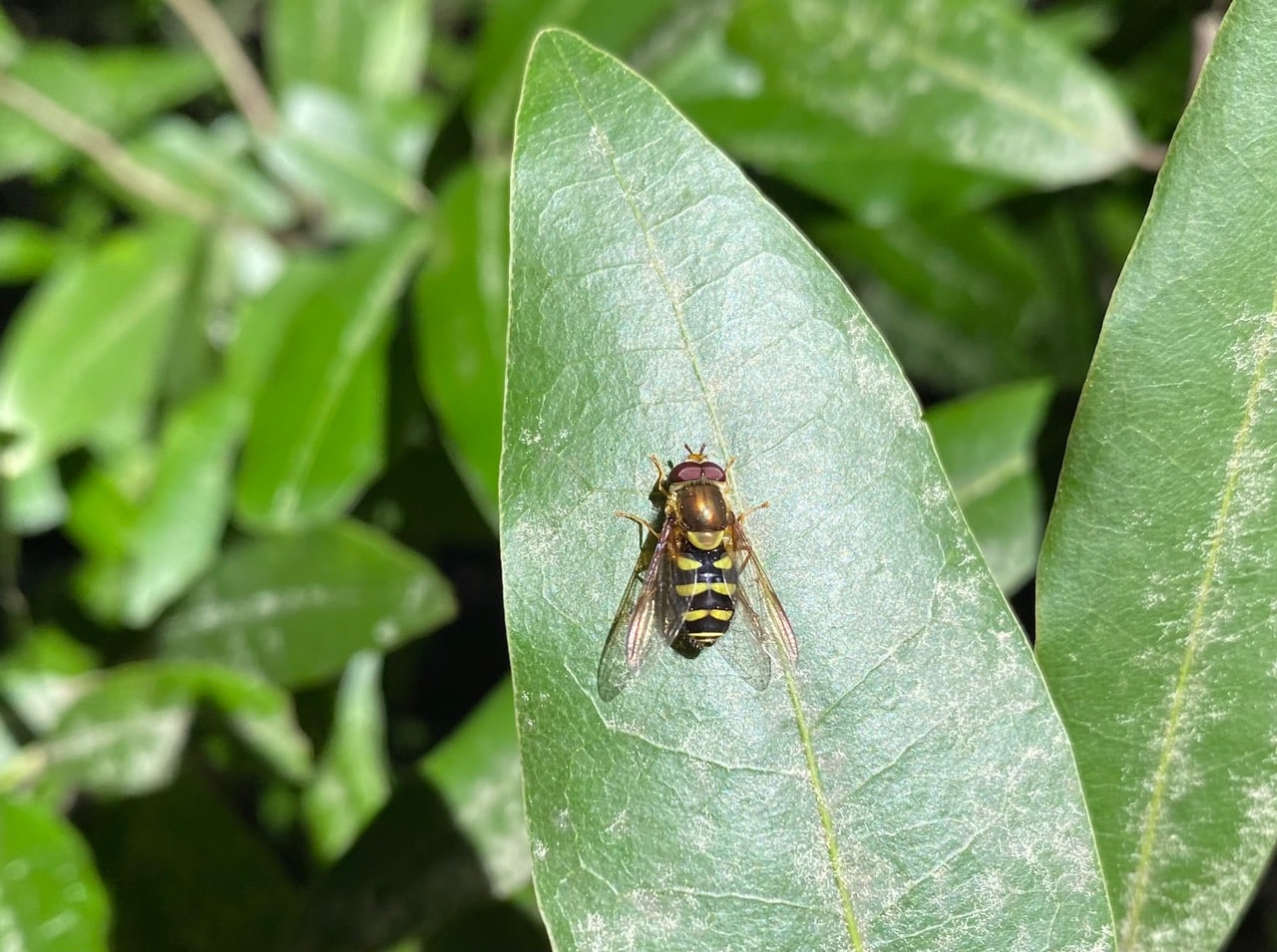 Another Black-margined Flower Fly, Syrphus opinator (family Syrphidae) has landed on a leaf of the Pacific Madrone, Arbutus menziesii to soak up the sun.