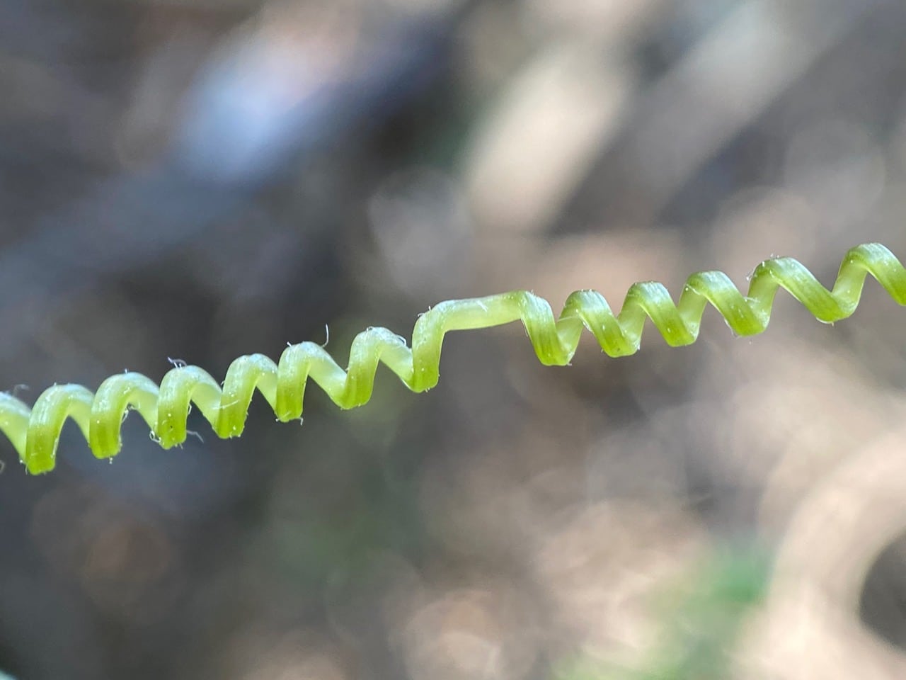 Long tendrils enable Marah to climb/trail over neighboring vegetation in order to reach sunlight. You can invariably find a straight section along a tendril coil where the coiling direction is reversed. Charles Darwin had noticed this behavior and coined it “perversion”. Scientists have actually studied the cucumber tendrils seriously and found some fascinating properties. Once a tendril curls around a support, it forms a counter-clockwise helix and clockwise helix with a straight section between the two. If the tendril is pulled, more turns are added to both helices to better grasp the support.