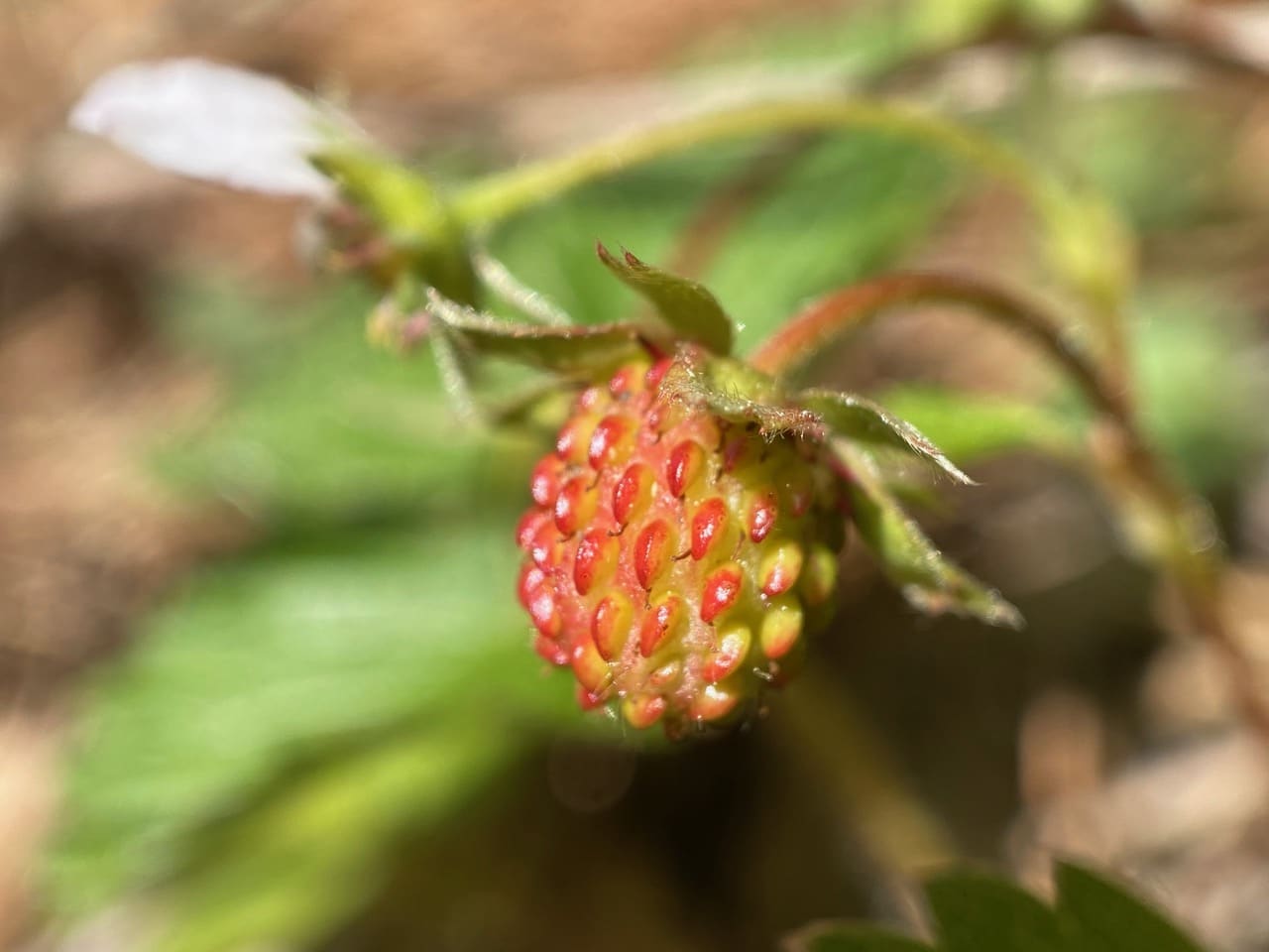 The Wood Strawberry fruits are ripening. And I mean fruits in the plural! This is not a single fruit, but an aggregate fruit. Every little bump here is a fruit, botanically speaking.