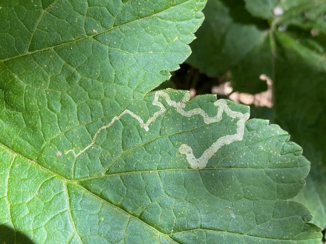 Close-up of one of the Cow Parsnip leaf mines. It is made by the larva of a Leafminer Fly, Phytomyza sp. (family Agromyzidae).