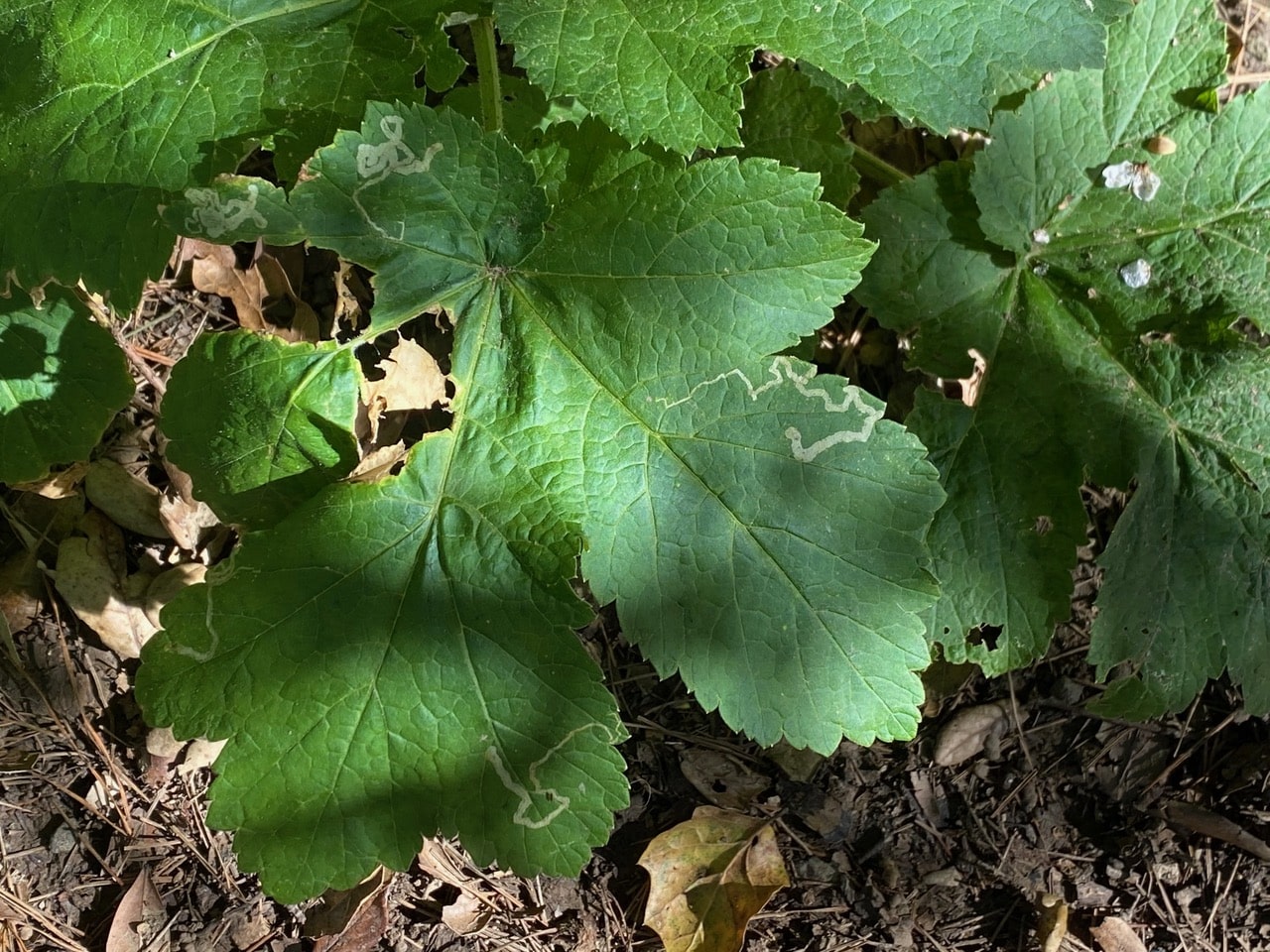 Under the dappled shade of the oak woodland, I spot a Cow Parsnip leaf that has squiggly lines on its upper surface.